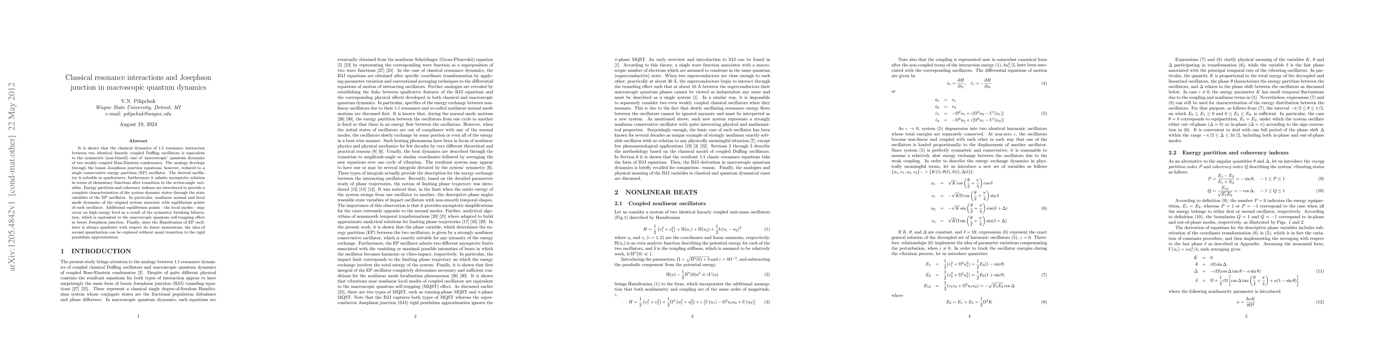 This paper demonstrates that classical resonance interactions between two Duffing oscillators mirror the quantum dynamics of two weakly coupled Bose-Einstein condensates via boson Josephson junction equations. The system is characterized by energy partition and coherency indexes, revealing equilibrium points and symmetry-breaking bifurcations akin to macroscopic quantum self-trapping.