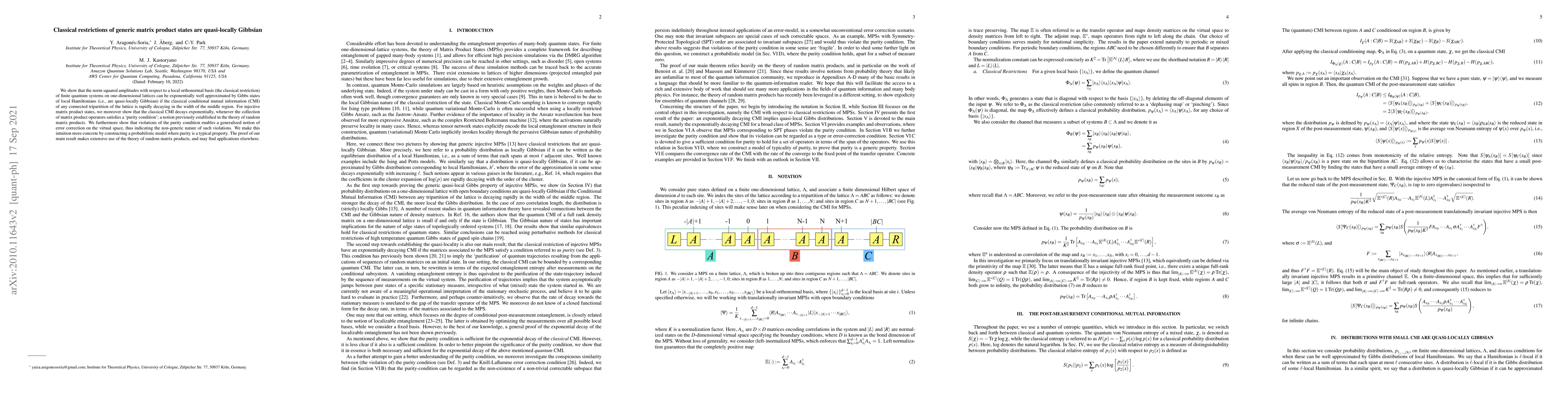 We show that the norm squared amplitudes with respect to a local orthonormal basis (the classical restriction) of finite quantum systems on one-dimensional lattices can be exponentially well approximated by Gibbs states of local Hamiltonians (i.e., are quasi-locally Gibbsian) if the classical conditional mutual information (CMI) of any connected tripartition of the lattice is rapidly decaying in the width of the middle region. For injective matrix product states, we moreover show that the classical CMI decays exponentially, whenever the collection of matrix product operators satisfies a 'purity condition'; a notion previously established in the theory of random matrix products. We furthermore show that violations of the purity condition enables a generalized notion of error correction on the virtual space, thus indicating the non-generic nature of such violations. We make this intuition more concrete by constructing a probabilistic model where purity is a typical property. The proof of our main result makes extensive use of the theory of random matrix products, and may find applications elsewhere.