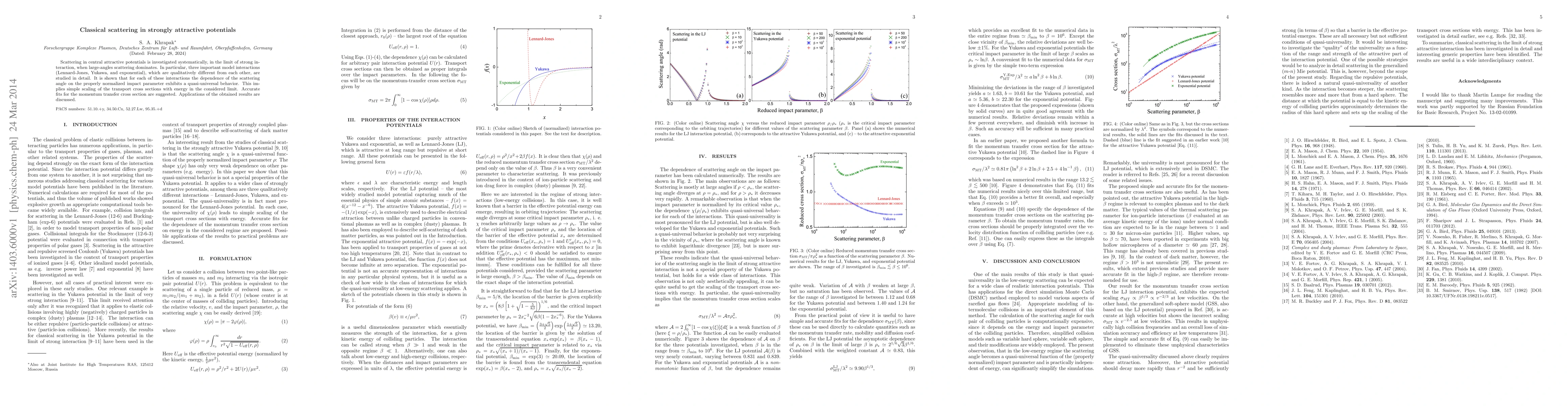 This paper investigates scattering in strong attractive potentials, focusing on large-angle scattering. It reveals quasi-universal behavior in the scattering angle dependence on the impact parameter for three model interactions, leading to simple energy scaling of transport cross sections and suggesting accurate fits for the momentum transfer cross section.