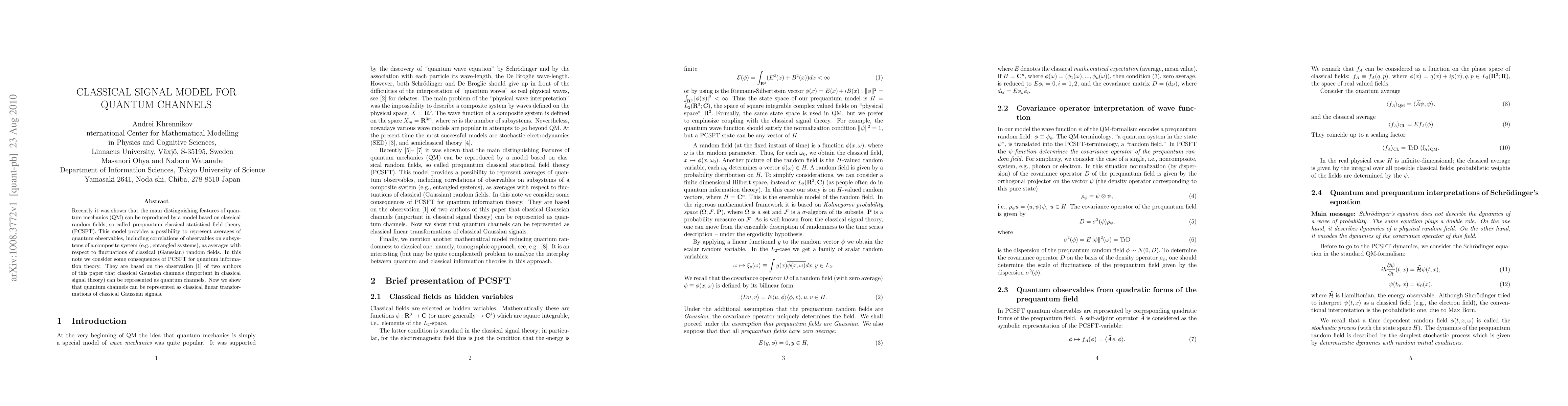 Recently it was shown that the main distinguishing features of quantum mechanics (QM) can be reproduced by a model based on classical random fields, so called prequantum classical statistical field theory (PCSFT). This model provides a possibility to represent averages of quantum observables, including correlations of observables on subsystems of a composite system (e.g., entangled systems), as averages with respect to fluctuations of classical (Gaussian) random fields. In this note we consider some consequences of PCSFT for quantum information theory. They are based on the observation \cite{W} of two authors of this paper that classical Gaussian channels (important in classical signal theory) can be represented as quantum channels. Now we show that quantum channels can be represented as classical linear transformations of classical Gaussian signal