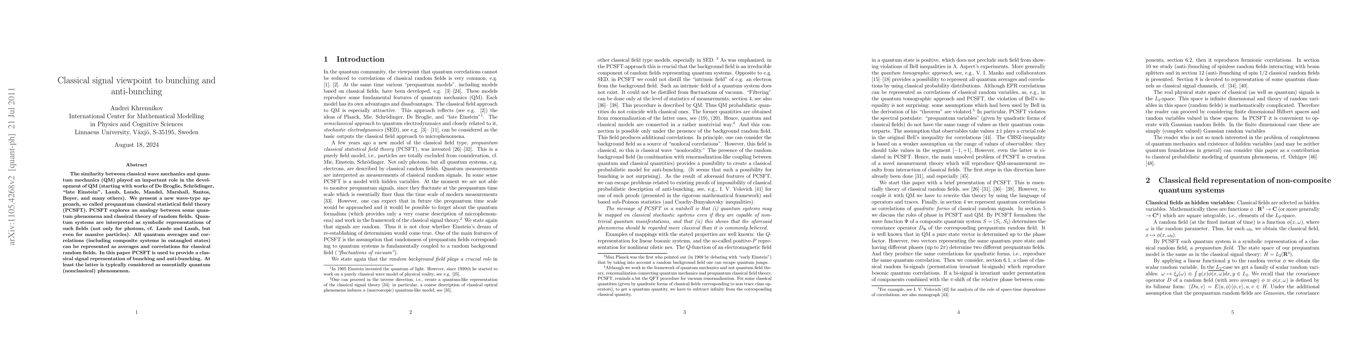 This paper introduces prequantum classical statistical field theory (PCSFT) to interpret quantum phenomena like bunching and anti-bunching through classical random fields, demonstrating that these typically quantum effects can be represented in classical terms. The PCSFT approach interprets quantum systems as symbolic representations of classical random fields, extending the analogy beyond photons to massive particles.
