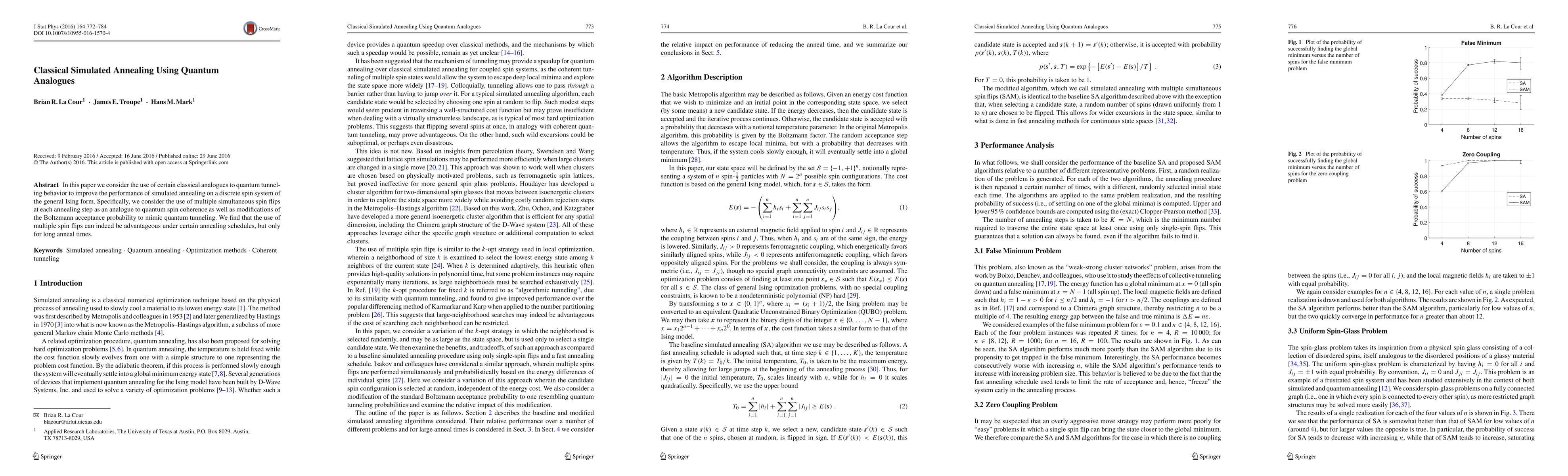 This paper explores classical simulated annealing techniques enhanced by quantum tunneling analogues, specifically multiple simultaneous spin flips and modified Boltzmann acceptance probabilities. The results show that these quantum-inspired modifications can improve performance, but only for extended annealing durations.