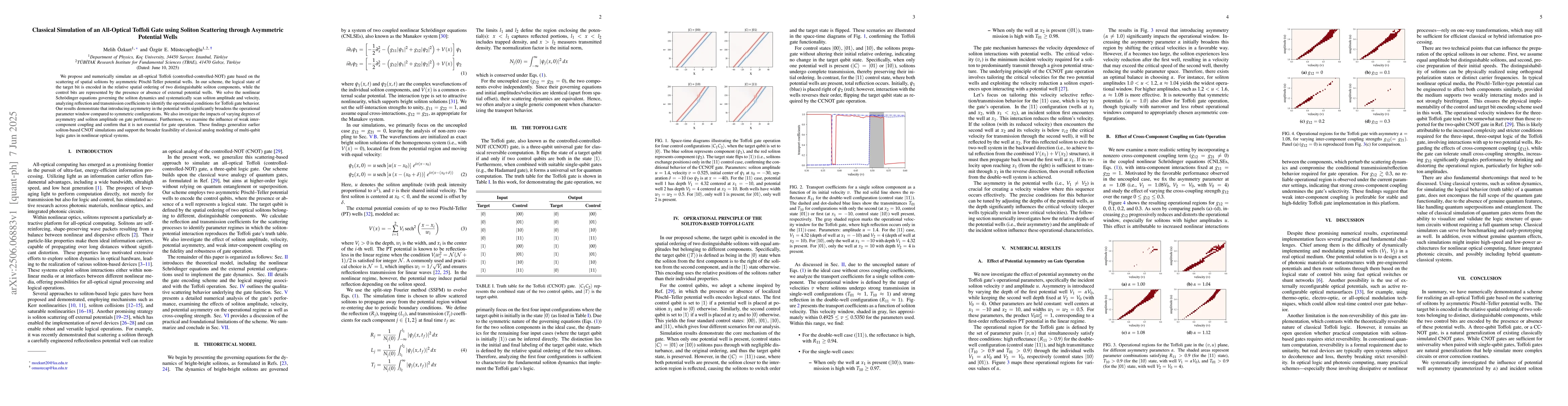 This research proposes an all-optical Toffoli gate using soliton scattering through asymmetric potential wells, demonstrating broader operational parameters with asymmetry. It also confirms weak inter-component coupling is not essential for gate operation, supporting classical analog modeling of multi-qubit logic gates in nonlinear optical systems.