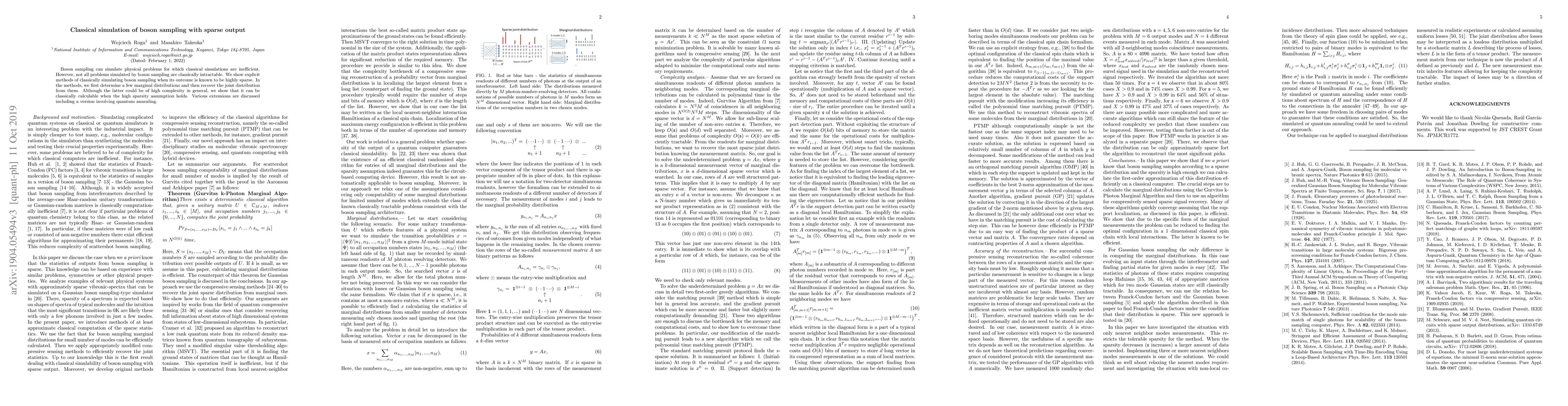 This paper explores efficient classical simulations for boson sampling when the output is sparse, demonstrating that while some marginal distributions are classically computable, recovering the full joint distribution remains complex. The authors propose methods for this recovery under high sparsity conditions and discuss potential extensions including quantum annealing.