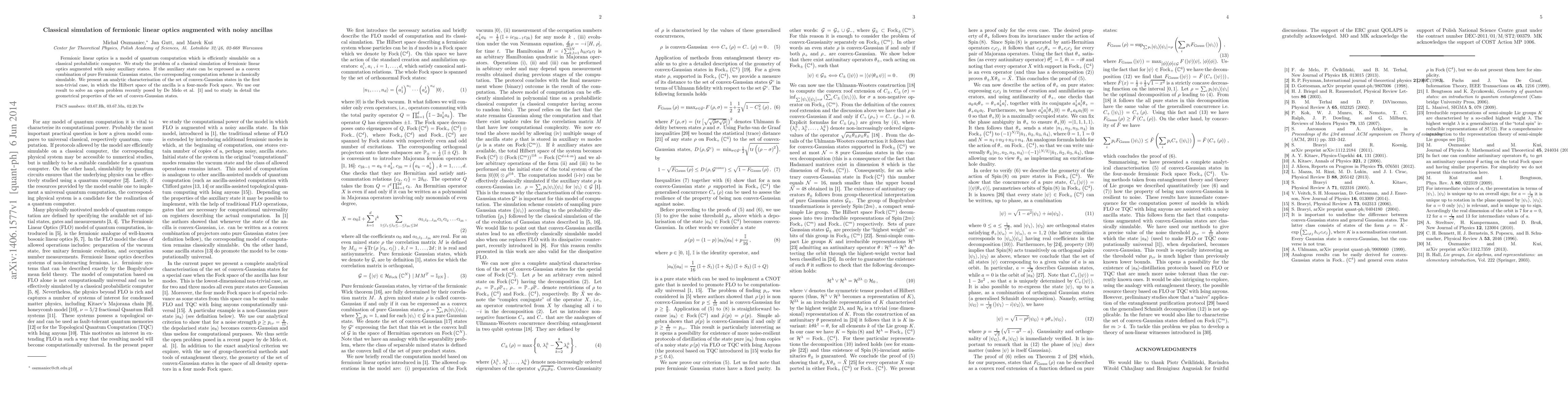 Fermionic linear optics is a model of quantum computation which is efficiently simulable on a classical probabilistic computer. We study the problem of a classical simulation of fermionic linear optics augmented with noisy auxiliary states. If the auxiliary state can be expressed as a convex combination of pure Fermionic Gaussian states, the corresponding computation scheme is classically simulable. We present an analytic characterisation of the set of convex-Gaussian states in the first non-trivial case, in which the Hilbert space of the ancilla is a four-mode Fock space. We use our result to solve an open problem recently posed by De Melo et al. and to study in detail the geometrical properties of the set of convex-Gaussian states.
