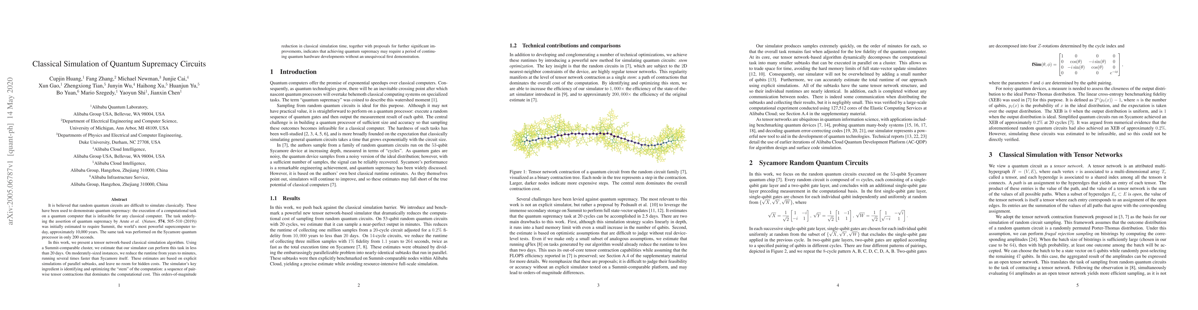 This paper presents a tensor network-based classical simulation algorithm that significantly reduces the time required to simulate quantum supremacy circuits, estimating that it can perform the task in less than 20 days compared to the 10,000 years estimated for the world's most powerful supercomputer. The algorithm optimizes the "stem" of the computation, leading to orders-of-magnitude improvements in simulation speed.