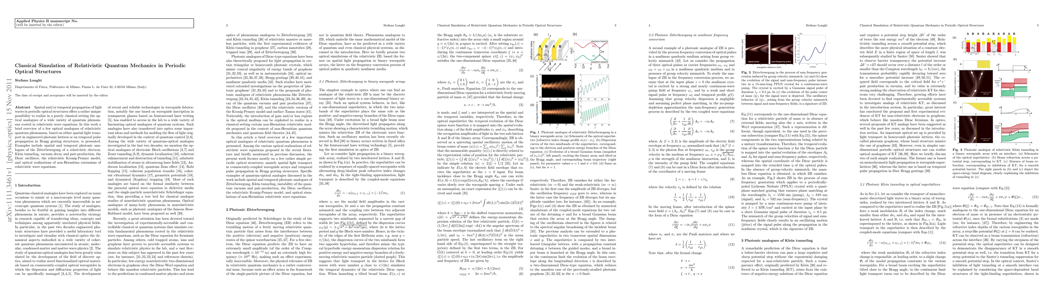 Spatial and/or temporal propagation of light waves in periodic optical structures offers a rather unique possibility to realize in a purely classical setting the optical analogues of a wide variety of quantum phenomena rooted in relativistic wave equations. In this work a brief overview of a few optical analogues of relativistic quantum phenomena, based on either spatial light transport in engineered photonic lattices or on temporal pulse propagation in Bragg grating structures, is presented. Examples include spatial and temporal photonic analogues of the Zitterbewegung of a relativistic electron, Klein tunneling, vacuum decay and pair-production, the Dirac oscillator, the relativistic Kronig-Penney model, and optical realizations of non-Hermitian extensions of relativistic wave equations.