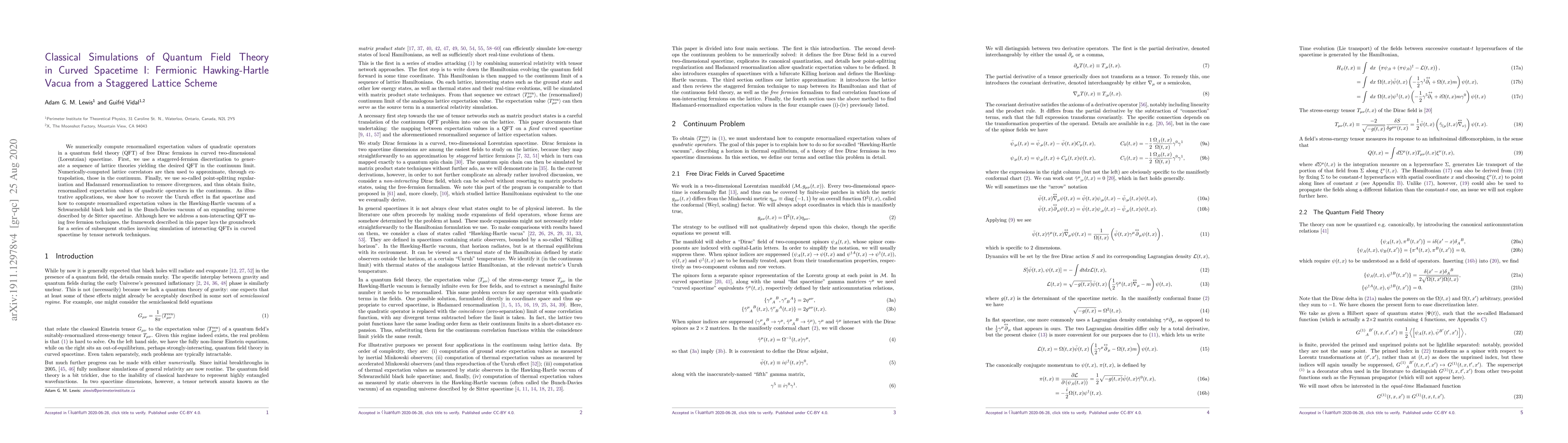 This paper presents a method for simulating quantum field theory of free Dirac fermions in curved spacetime using staggered lattice discretization, with a focus on computing renormalized expectation values. The study demonstrates the recovery of the Unruh effect and calculates renormalized values in the Hawking-Hartle vacuum and Bunch-Davies vacuum, laying a foundation for future simulations of interacting quantum field theories.