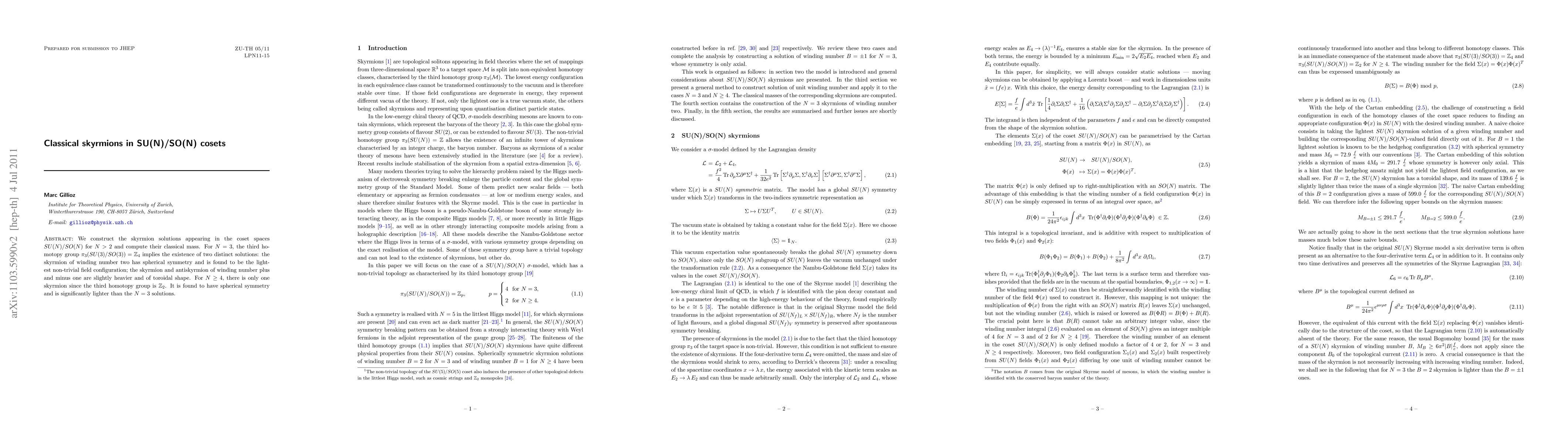 We construct the skyrmion solutions appearing in the coset spaces SU(N)/SO(N) for N > 2 and compute their classical mass. For N = 3, the third homotopy group pi_3(SU(3)/SO(3)) = Z_4 implies the existence of two distinct solutions: the skyrmion of winding number two has spherical symmetry and is found to be the lightest non-trivial field configuration; the skyrmion and antiskyrmion of winding number plus and minus one are slightly heavier and of toroidal shape. For N >= 4, there is only one skyrmion since the third homotopy group is Z_2. It is found to have spherical symmetry and is significantly lighter than the N = 3 solutions.