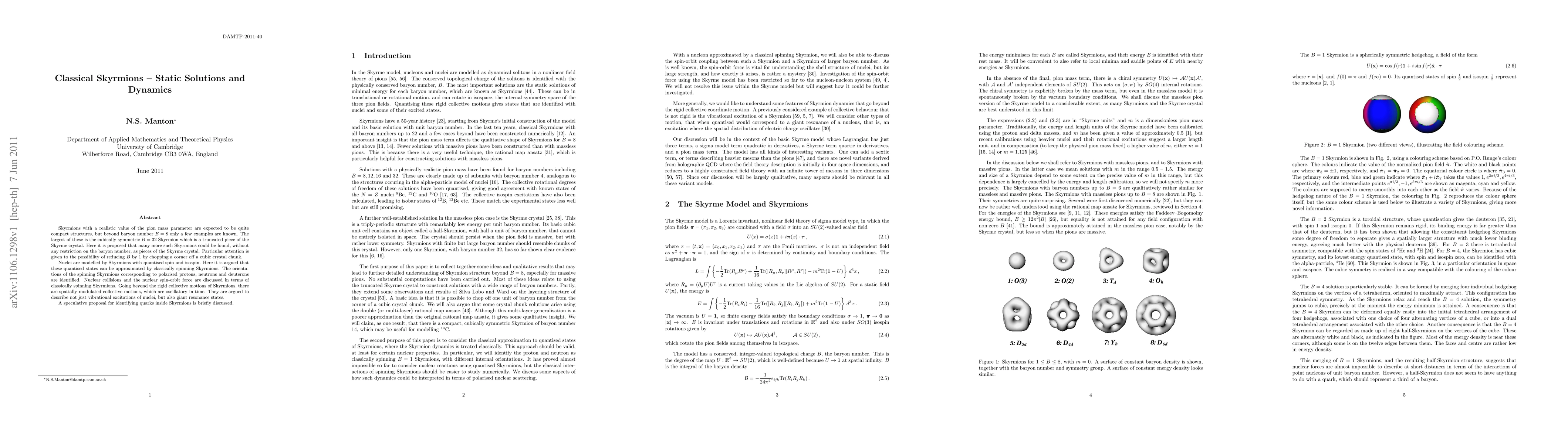 Skyrmions with a realistic value of the pion mass parameter are expected to be quite compact structures, but beyond baryon number B=8 only a few examples are known. The largest of these is the cubically symmetric B=32 Skyrmion which is a truncated piece of the Skyrme crystal. Here it is proposed that many more such Skyrmions could be found, without any restriction on the baryon number, as pieces of the Skyrme crystal. Particular attention is given to the possibility of reducing B by 1 by chopping a corner off a cubic crystal chunk. Nuclei are modelled by Skyrmions with quantised spin and isospin. Here it is argued that these quantised states can be approximated by classically spinning Skyrmions. The orientations of the spinning Skyrmions corresponding to polarised protons, neutrons and deuterons are identified. Nuclear collisions and the nuclear spin-orbit force are discussed in terms of classically spinning Skyrmions. Going beyond the rigid collective motions of Skyrmions, there are spatially modulated collective motions, which are oscillatory in time. They are argued to describe not just vibrational excitations of nuclei, but also giant resonance states. A speculative proposal for identifying quarks inside Skyrmions is briefly discussed.