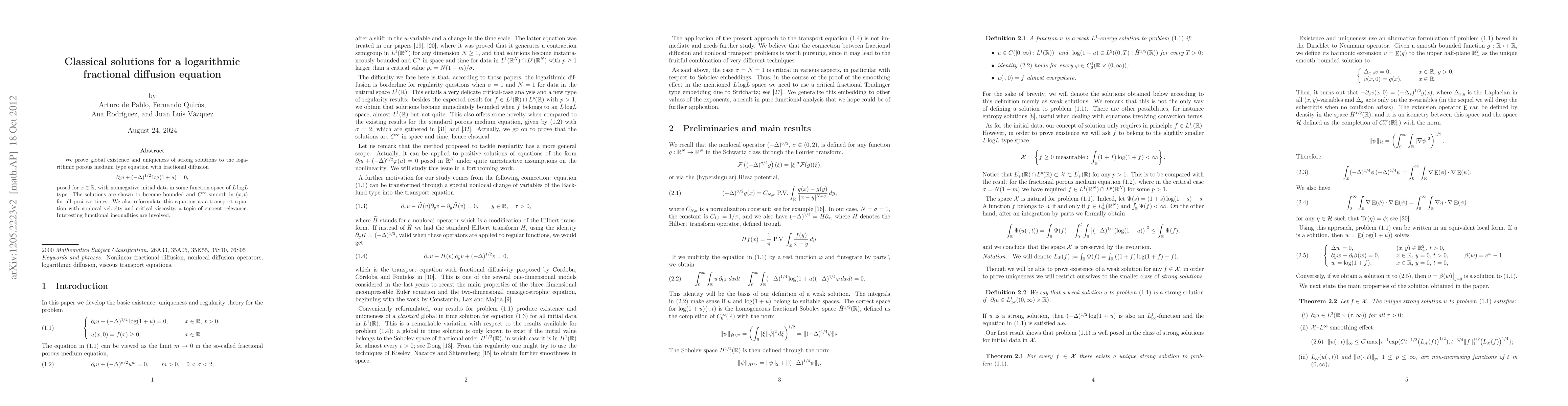 This paper proves global existence and uniqueness of strong solutions for a logarithmic fractional diffusion equation, demonstrating that solutions remain bounded and smooth for all positive times. The authors also reformulate the equation as a transport equation with nonlocal velocity and critical viscosity, highlighting relevant functional inequalities.