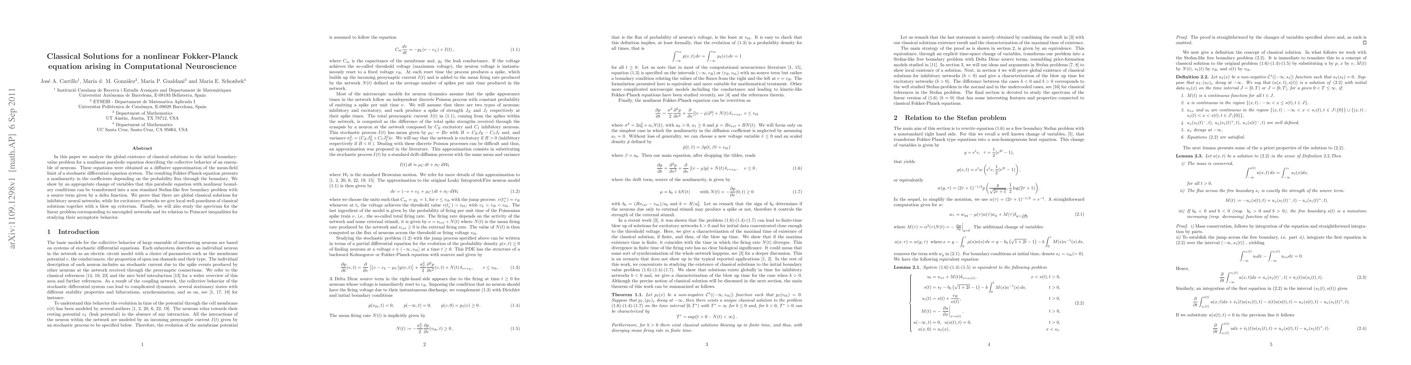 In this paper we analyze the global existence of classical solutions to the initial boundary-value problem for a nonlinear parabolic equation describing the collective behavior of an ensemble of neurons. These equations were obtained as a diffusive approximation of the mean-field limit of a stochastic differential equation system. The resulting Fokker-Planck equation presents a nonlinearity in the coefficients depending on the probability flux through the boundary. We show by an appropriate change of variables that this parabolic equation with nonlinear boundary conditions can be transformed into a non standard Stefan-like free boundary problem with a source term given by a delta function. We prove that there are global classical solutions for inhibitory neural networks, while for excitatory networks we give local well-posedness of classical solutions together with a blow up criterium. Finally, we will also study the spectrum for the linear problem corresponding to uncoupled networks and its relation to Poincar\'e inequalities for studying their asymptotic behavior.