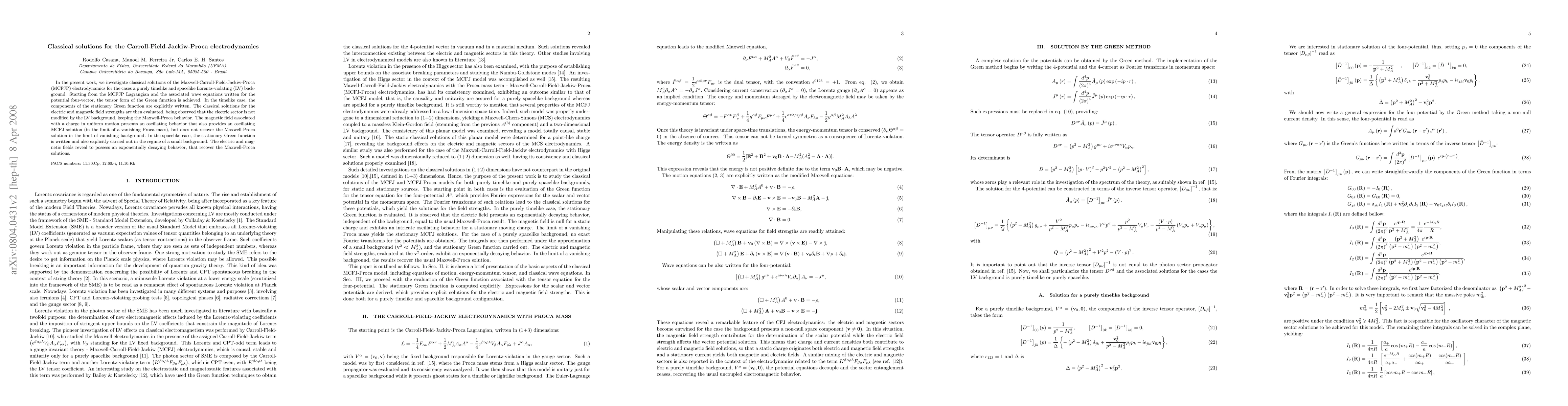 In the present work, we investigate classical solutions of the Maxwell-Carroll-Field-Jackiw-Proca (MCFJP) electrodynamics for the cases a purely timelike and spacelike Lorentz-violating (LV) background. Starting from the MCFJP Lagrangian and the associated wave equations written for the potential four-vector, the tensor form of the Green function is achieved. In the timelike case, the components of the stationary Green function are explicitly written. The classical solutions for the electric and magnetic field strengths are then evaluated, being observed that the electric sector is not modified by the LV background, keeping the Maxwell-Proca behavior. The magnetic field associated with a charge in uniform motion presents an oscillating behavior that also provides an oscillating MCFJ solution (in the limit of a vanishing Proca mass), but does not recover the Maxwell-Proca solution in the limit of vanishing background. In the spacelike case, the stationary Green function is written and also explicitly carried out in the regime of a small background. The electric and magnetic fields reveal to possess an exponentially decaying behavior, that recover the Maxwell-Proca solutions.