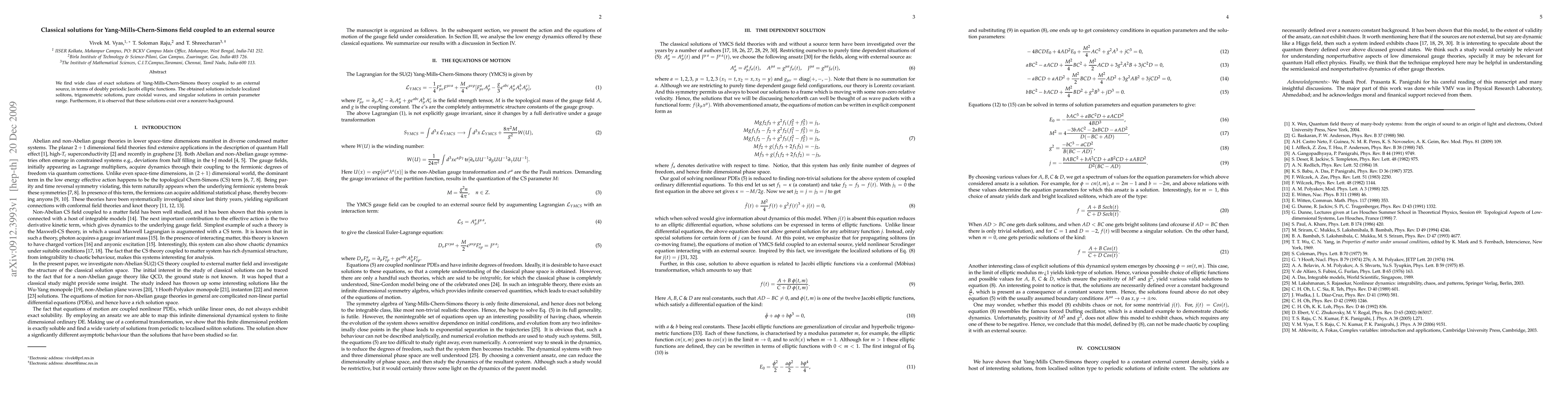 Summary: The paper presents a wide range of exact solutions for Yang-Mills-Chern-Simons theory coupled to an external source, expressed via doubly periodic Jacobi elliptic functions, including localized solitons and trigonometric solutions, all existing over a nonzero background. These solutions encompass cnoidal waves and singular solutions within specific parameter ranges.