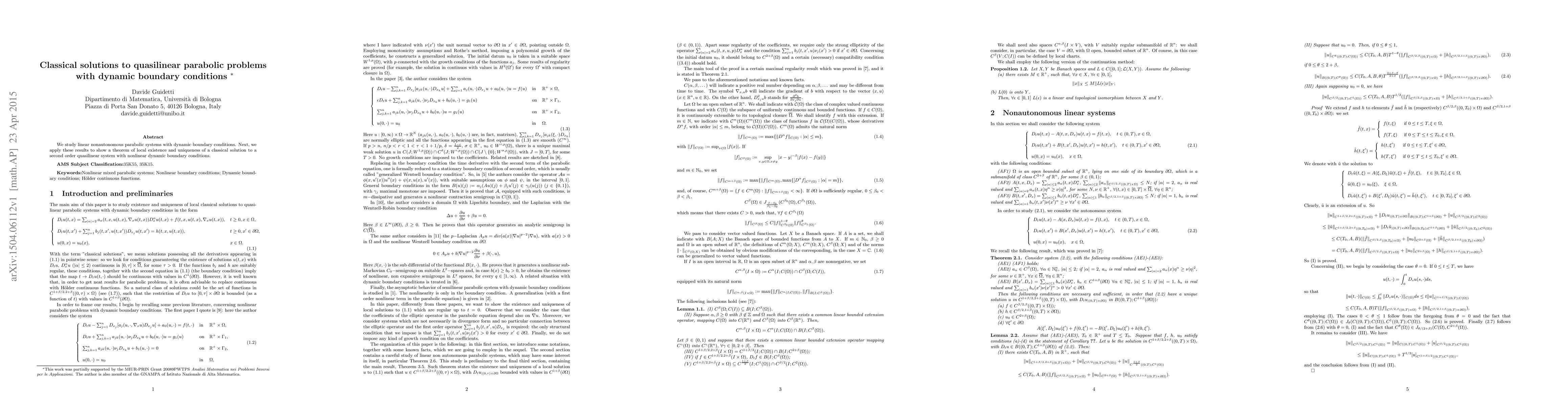 This paper investigates linear nonautonomous parabolic systems featuring dynamic boundary conditions and proves a theorem for local existence and uniqueness of classical solutions to a second-order quasilinear system with nonlinear dynamic boundary conditions.
