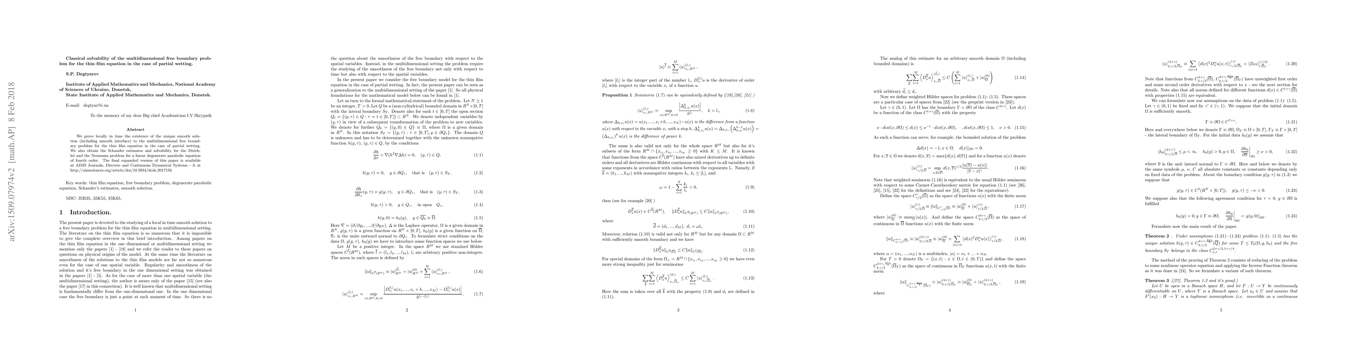 This paper proves the local existence and uniqueness of smooth solutions to the multidimensional free boundary problem for the thin film equation under partial wetting, along with Schauder estimates and solvability for related linear degenerate parabolic equations. The full version is published in Discrete and Continuous Dynamical Systems - A.