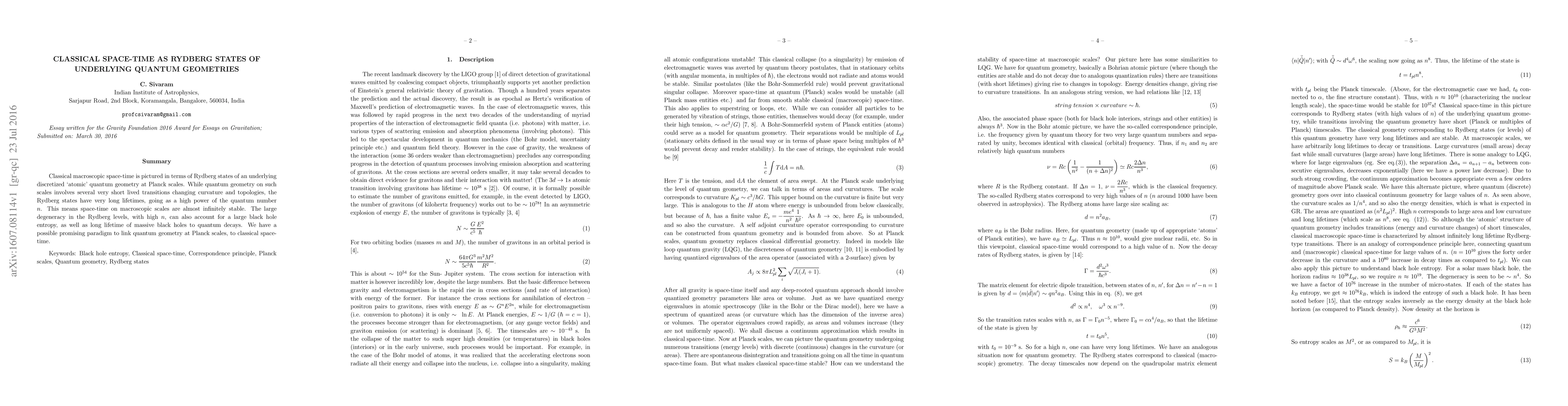 This paper proposes that classical macroscopic space-time emerges as Rydberg states of an underlying quantized geometry at Planck scales, offering stability and explaining black hole entropy and longevity through the high degeneracy of these states. It suggests a novel paradigm linking quantum geometry to classical space-time.