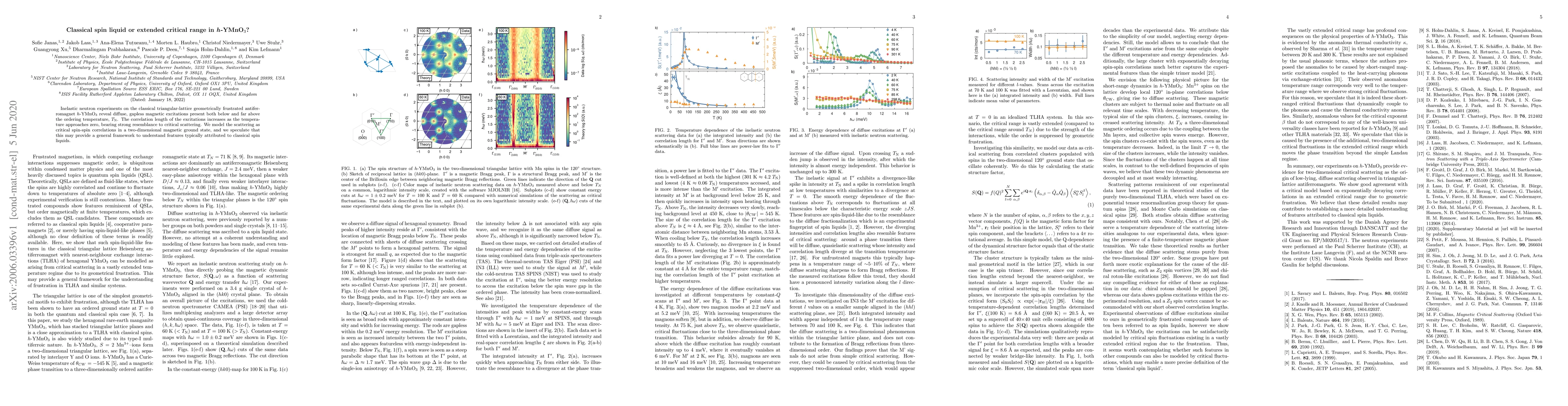 Inelastic neutron experiments on the classical triangular-lattice geometrically frustrated antiferromagnet h-YMnO$_3$ reveal diffuse, gapless magnetic excitations present both below and far above the ordering temperature, $T_N$. The correlation length of the excitations increases as the temperature approaches zero, bearing strong resemblance to critical scattering. We model the scattering as critical spin-spin correlations in a two-dimensional magnetic ground state, and we speculate that this may provide a general framework to understand features typically attributed to classical spin liquids.