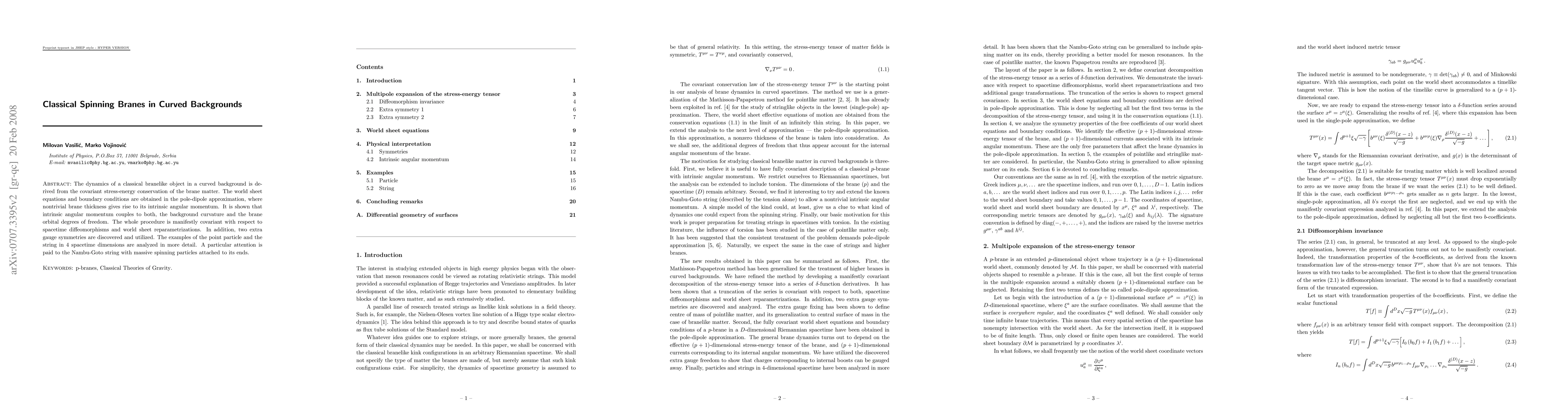 This paper derives the dynamics of classical spinning branes in curved spacetimes using covariant stress-energy conservation, revealing intrinsic angular momentum coupling to both background curvature and brane orbital degrees of freedom. Detailed analysis includes point particles and strings in 4D, with a focus on Nambu-Goto strings with massive spinning particles at their ends.