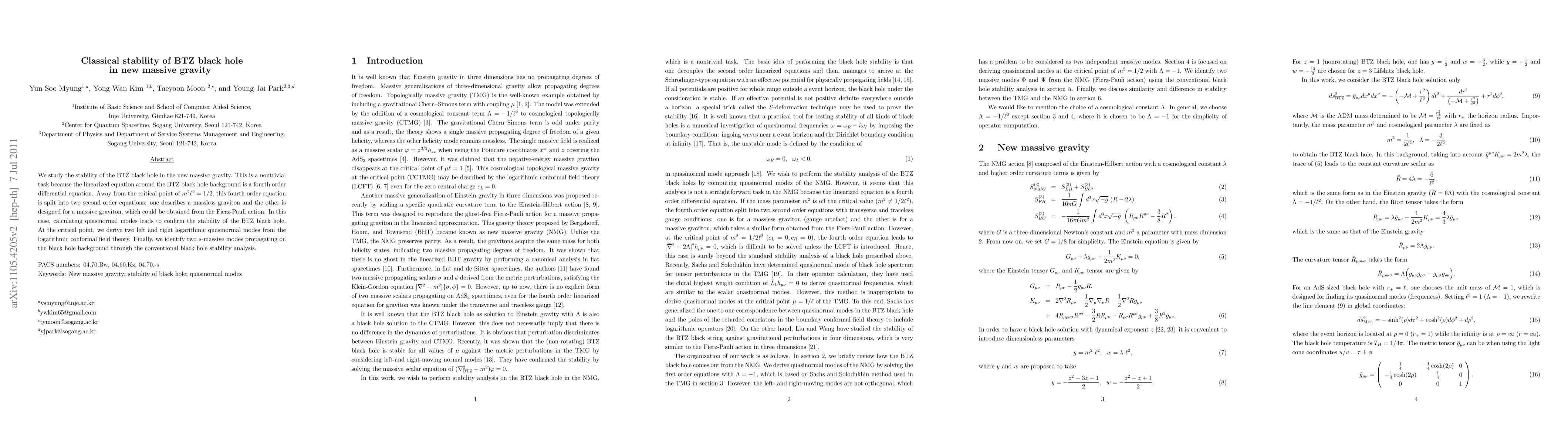 This paper investigates the stability of BTZ black holes in the context of new massive gravity, confirming stability via quasinormal mode calculations. It reveals distinct behavior for massive gravitons away from the critical point $m^2 l^2=1/2$, and identifies logarithmic modes at the critical point.