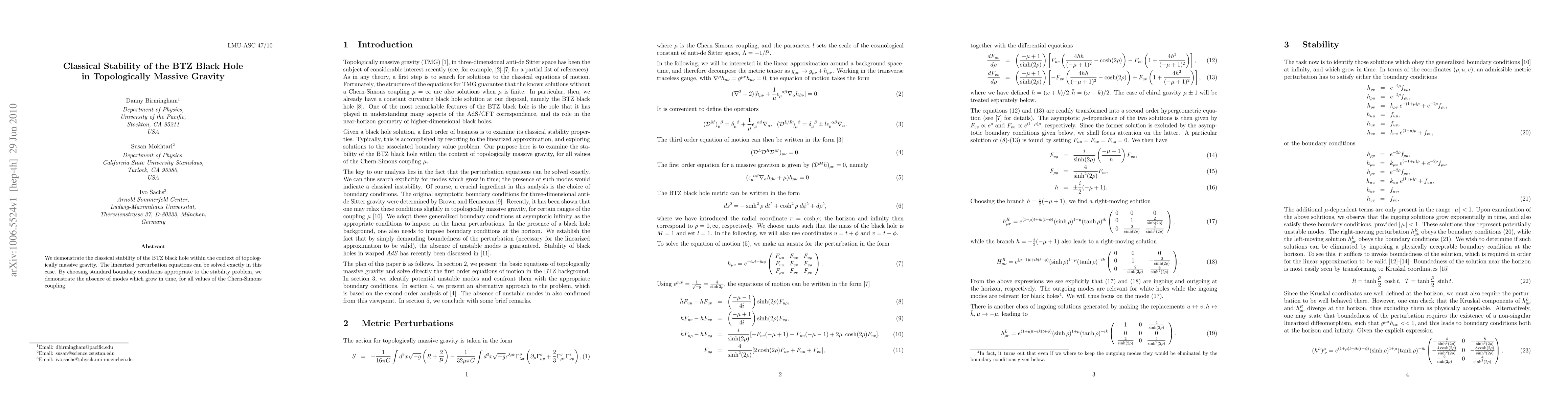 The paper demonstrates the classical stability of BTZ black holes in topologically massive gravity by solving the linearized perturbation equations exactly and showing no growing modes under standard boundary conditions, regardless of the Chern-Simons coupling.
