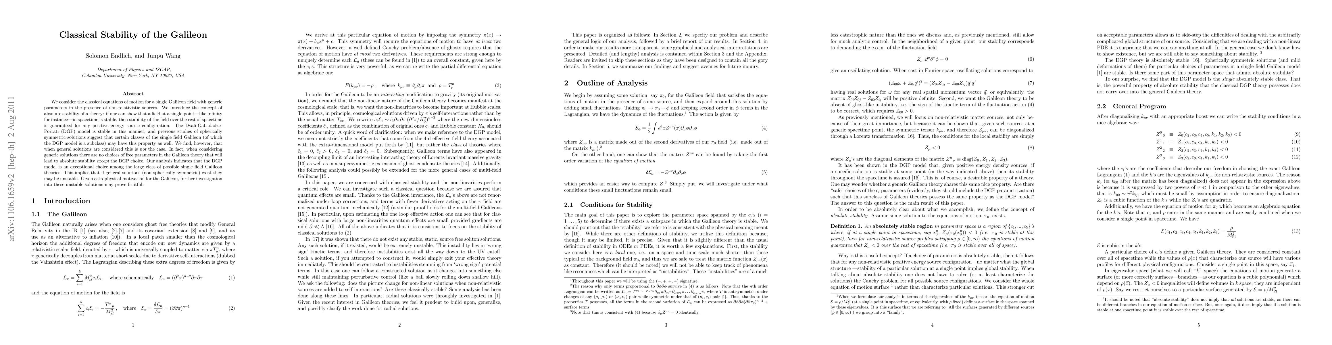 This paper investigates the classical stability of the Galileon field, finding that while the Dvali-Gabadadze-Porrati (DGP) model exhibits absolute stability, general solutions of the Galileon theory do not. The DGP model is shown to be an exceptional case, suggesting that non-spherically symmetric solutions may be unstable.