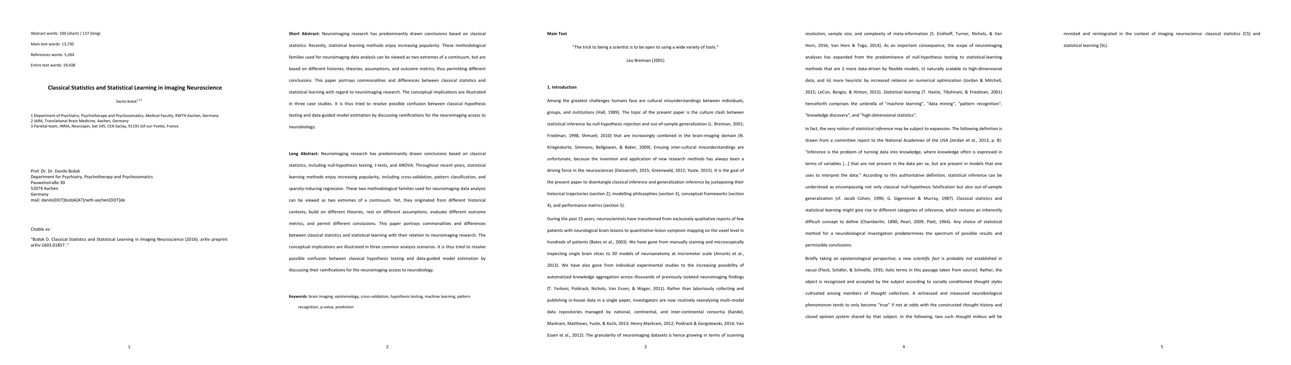 Neuroimaging research has predominantly drawn conclusions based on classical statistics, including null-hypothesis testing, t-tests, and ANOVA. Throughout recent years, statistical learning methods enjoy increasing popularity, including cross-validation, pattern classification, and sparsity-inducing regression. These two methodological families used for neuroimaging data analysis can be viewed as two extremes of a continuum. Yet, they originated from different historical contexts, build on different theories, rest on different assumptions, evaluate different outcome metrics, and permit different conclusions. This paper portrays commonalities and differences between classical statistics and statistical learning with their relation to neuroimaging research. The conceptual implications are illustrated in three common analysis scenarios. It is thus tried to resolve possible confusion between classical hypothesis testing and data-guided model estimation by discussing their ramifications for the neuroimaging access to neurobiology.