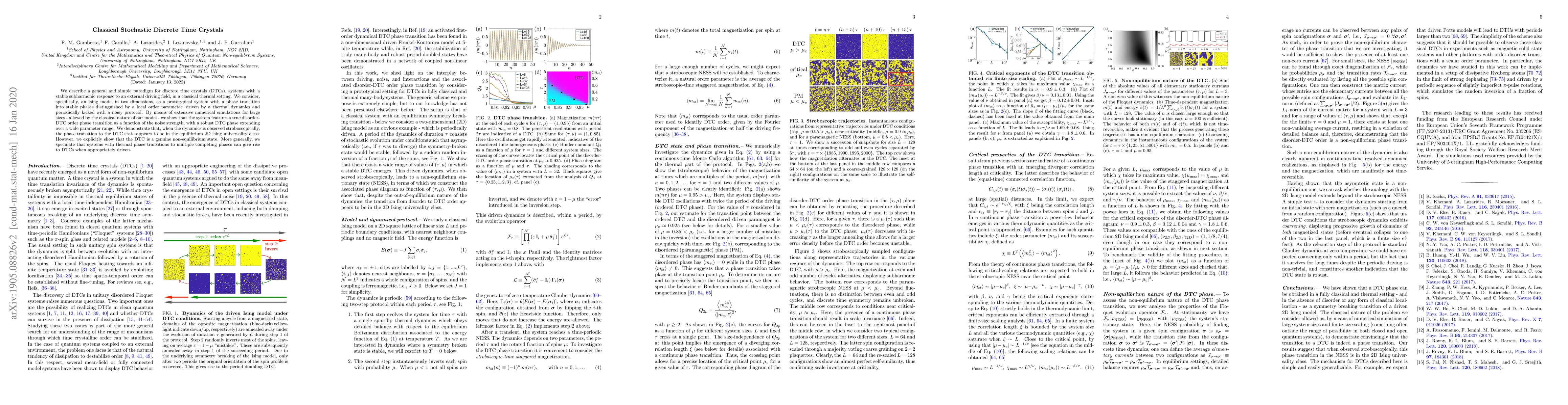 This paper proposes a classical thermal model for discrete time crystals (DTCs) using a 2D Ising model, demonstrating stable DTC dynamics that break time-translational invariance. The study reveals that while the phase transition to DTC resembles equilibrium 2D Ising behavior, the DTC state is a non-equilibrium phenomenon.