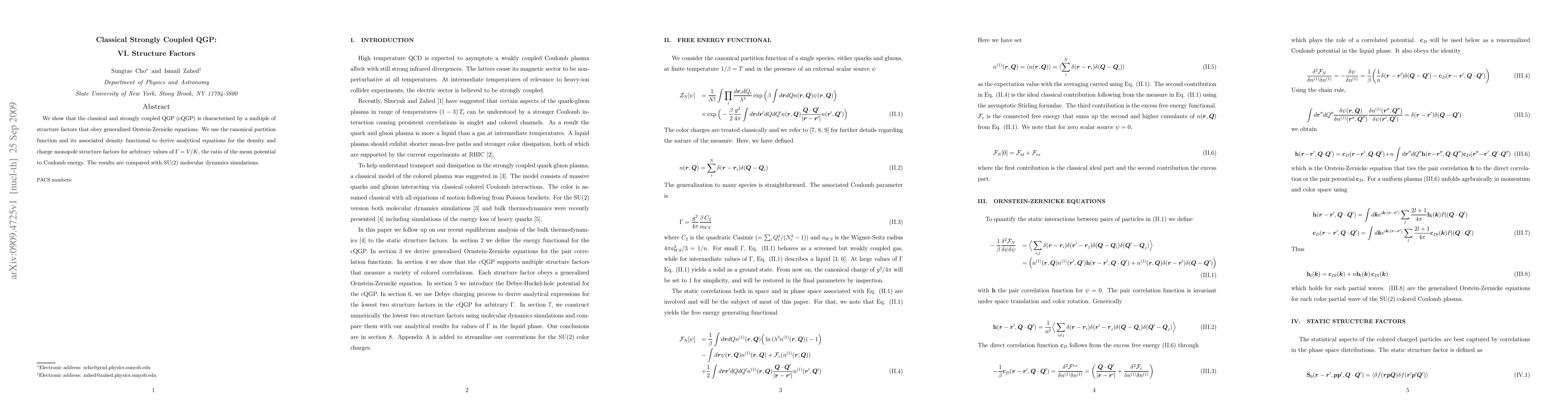 We show that the classical and strongly coupled QGP (cQGP) is characterized by a multiple of structure factors that obey generalized Orstein-Zernicke equations. We use the canonical partition function and its associated density functional to derive analytical equations for the density and charge monopole structure factors for arbitrary values of $\Gamma=V/K$, the ratio of the mean potential to Coulomb energy. The results are compared with SU(2) molecular dynamics simulations.