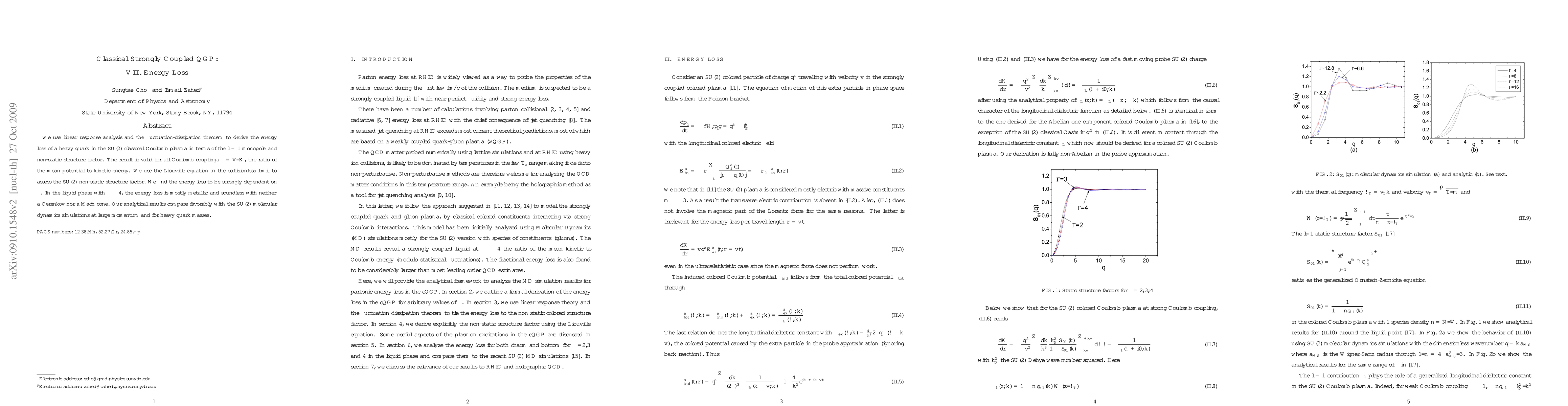 We use linear response analysis and the fluctuation-dissipation theorem to derive the energy loss of a heavy quark in the SU(2) classical Coulomb plasma in terms of the $l=1$ monopole and non-static structure factor. The result is valid for all Coulomb couplings $\Gamma=V/K$, the ratio of the mean potential to kinetic energy. We use the Liouville equation in the collisionless limit to assess the SU(2) non-static structure factor. We find the energy loss to be strongly dependent on $\Gamma$. In the liquid phase with $\Gamma\approx 4$, the energy loss is mostly metallic and soundless with neither a Cerenkov nor a Mach cone. Our analytical results compare favorably with the SU(2) molecular dynamics simulations at large momentum and for heavy quark masses.