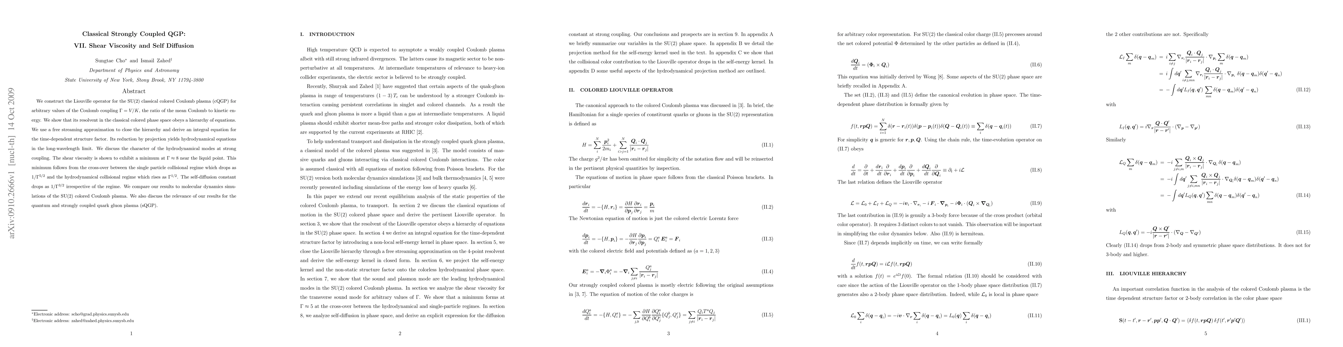 We construct the Liouville operator for the SU(2) classical colored Coulomb plasma (cQGP) for arbitrary values of the Coulomb coupling $\Gamma=V/K$, the ratio of the mean Coulomb to kinetic energy. We show that its resolvent in the classical colored phase space obeys a hierarchy of equations. We use a free streaming approximation to close the hierarchy and derive an integral equation for the time-dependent structure factor. Its reduction by projection yields hydrodynamical equations in the long-wavelength limit. We discuss the character of the hydrodynamical modes at strong coupling. The shear viscosity is shown to exhibit a minimum at $\Gamma\approx 8$ near the liquid point. This minimum follows from the cross-over between the single particle collisional regime which drops as $1/\Gamma^{5/2}$ and the hydrodynamical collisional regime which rises as $\Gamma^{1/2}$. The self-diffusion constant drops as $1/\Gamma^{3/2}$ irrespective of the regime. We compare our results to molecular dynamics simulations of the SU(2) colored Coulomb plasma. We also discuss the relevance of our results for the quantum and strongly coupled quark gluon plasma (sQGP)