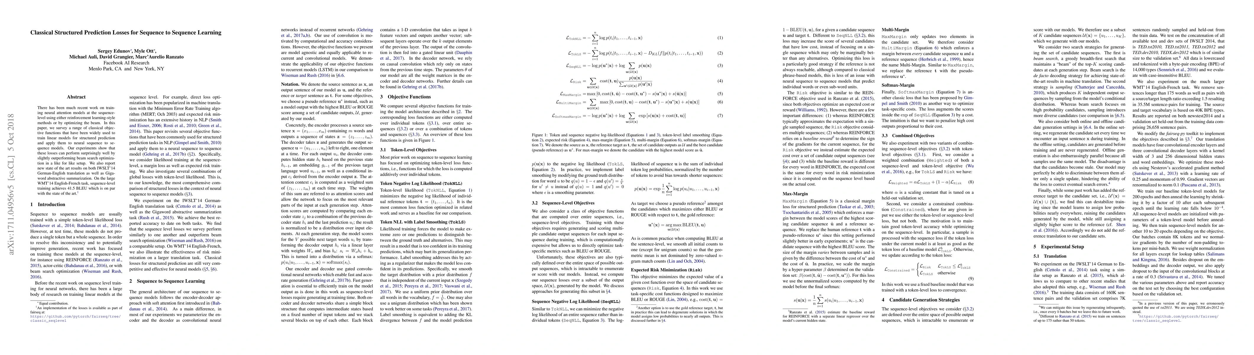 This paper surveys classical structured prediction losses traditionally used for linear models and applies them to neural sequence-to-sequence models. The experiments reveal these losses can outperform beam search optimization, achieving new state-of-the-art results in German-English translation and abstractive summarization, and competitive BLEU scores in English-French translation.