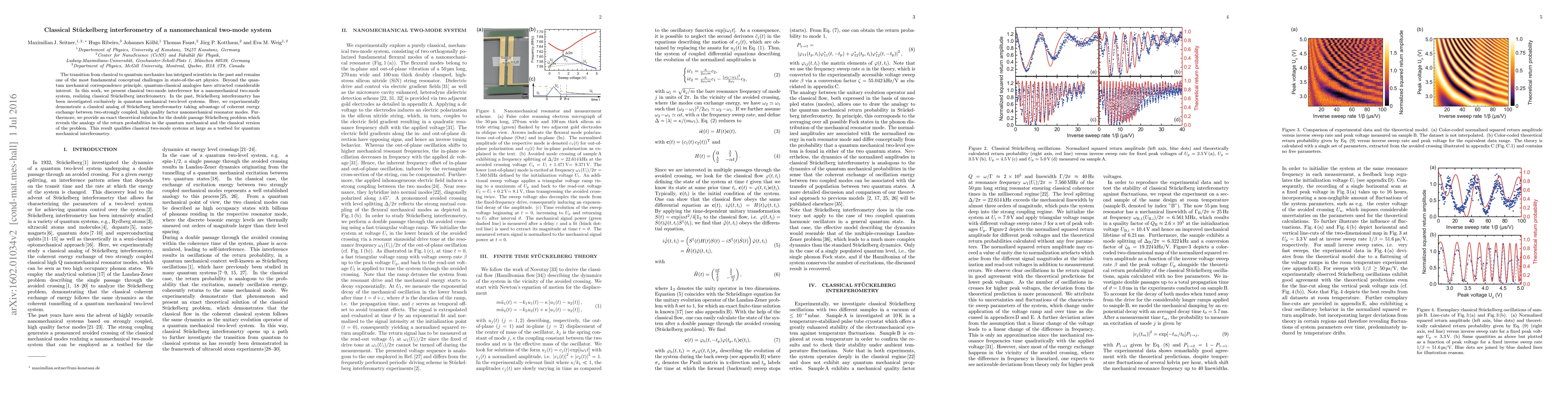 This paper demonstrates classical St\"uckelberg interferometry in a nanomechanical two-mode system at room temperature, showcasing coherent energy exchange between coupled resonator modes. It provides a theoretical solution revealing the analogy between classical and quantum versions of the St\"uckelberg problem, positioning classical systems as potential testbeds for quantum interferometry.