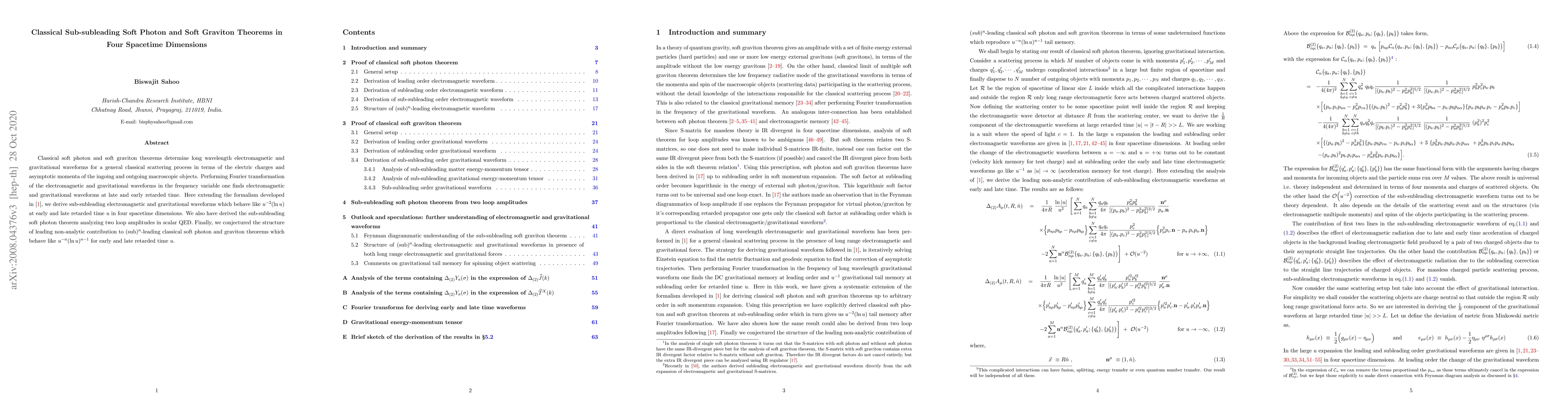 This paper extends classical soft photon and soft graviton theorems to derive sub-subleading waveforms in four dimensions, showing behavior like $u^{-2}(\ln u)$ for early and late times. It also analyzes two-loop amplitudes in scalar QED to support the sub-subleading soft photon theorem.
