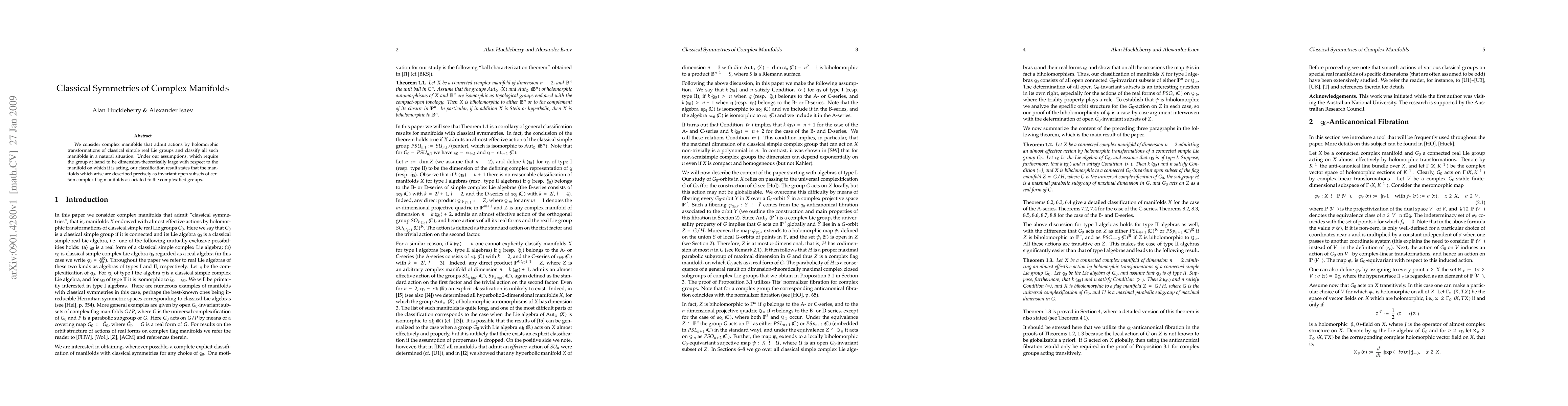 We consider complex manifolds that admit actions by holomorphic transformations of classical simple real Lie groups and classify all such manifolds in a natural situation. Under our assumptions, which require the group at hand to be dimension-theoretically large with respect to the manifold on which it is acting, our classification result states that the manifolds which arise are described precisely as invariant open subsets of certain complex flag manifolds associated to the complexified groups.