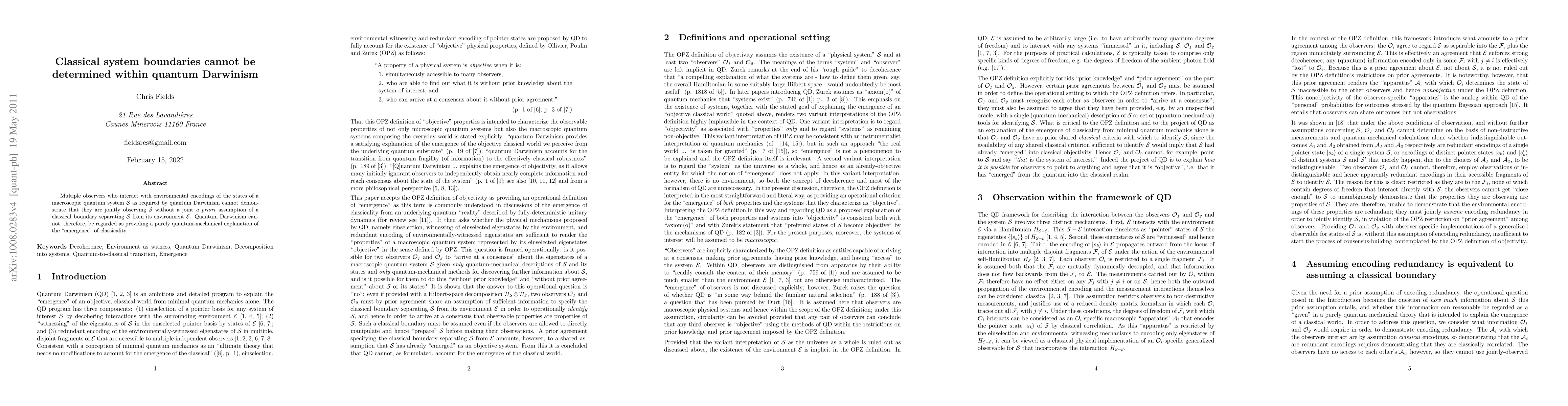 Summary: Quantum Darwinism fails to determine classical system boundaries without a prior assumption of separation from the environment, indicating it does not offer a purely quantum-mechanical explanation for the emergence of classicality.