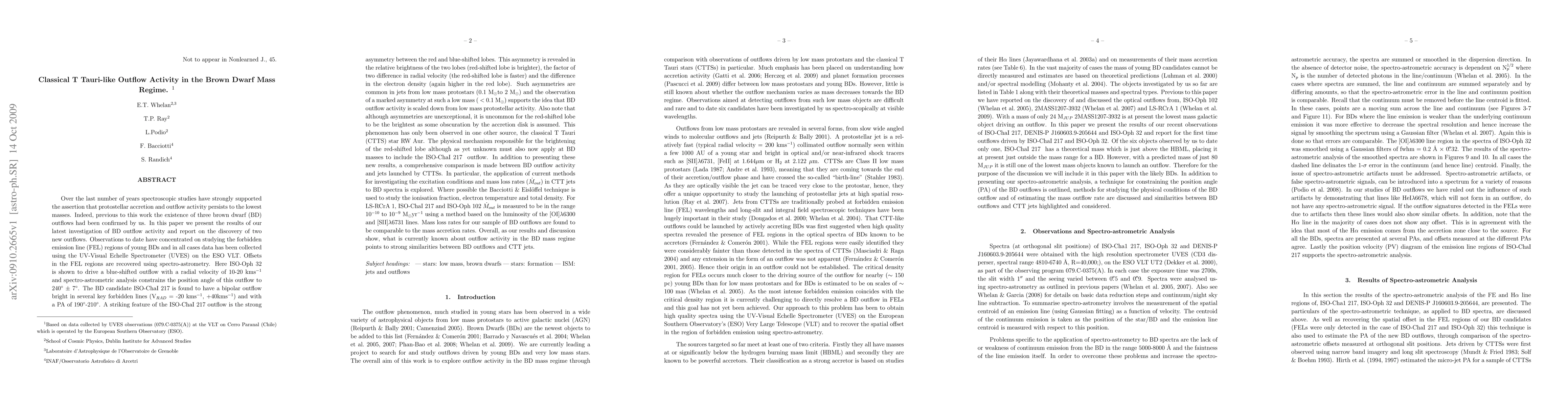 Over the last number of years spectroscopic studies have strongly supported the assertion that protostellar accretion and outflow activity persists to the lowest masses. In this paper we present the results of our latest investigation of brown dwarf (BD) outflow activity and report on the discovery of two new outflows. Here ISO-Oph 32 is shown to drive a blue-shifted outflow with a radial velocity of 10-20 km/s and spectro-astrometric analysis constrains the position angle of this outflow to 240 +/- 7 degrees. The BD candidate ISO-Cha1 217 is found to have a bipolar outflow bright in several key forbidden lines (radial velocity = -20 km/s, +40 km/s) and with a PA of 190-210 degrees. A striking feature of the ISO-Cha1 217 outflow is the strong asymmetry between the red and blue-shifted lobes. This asymmetry is revealed in the relative brightness of the two lobes (red-shifted lobe is brighter), the factor of two difference in radial velocity (the red-shifted lobe is faster) and the difference in the electron density (again higher in the red lobe). Such asymmetries are common in jets from low mass protostars and the observation of a marked asymmetry at such a low mass supports the idea that BD outflow activity is scaled down from low mass protostellar activity. In addition to presenting these new results, a comprehensive comparison is made between BD outflow activity and jets launched by CTTSs. In particular, the application of current methods for investigating the excitation conditions and mass loss rates in CTT jets to BD spectra is explored.