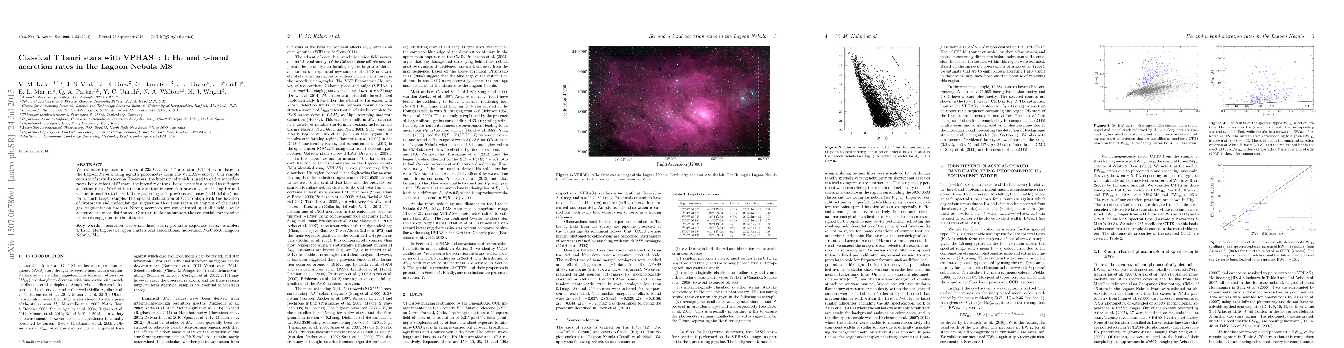 This paper estimates accretion rates for 235 Classical T Tauri stars in the Lagoon Nebula using VPHAS+ survey data, finding a mean variation of 0.17 dex between H$\alpha$ and $u$-band measurements. The spatial distribution of these stars aligns with protostars and molecular gas, indicating a connection to the natal gas fragmentation process.