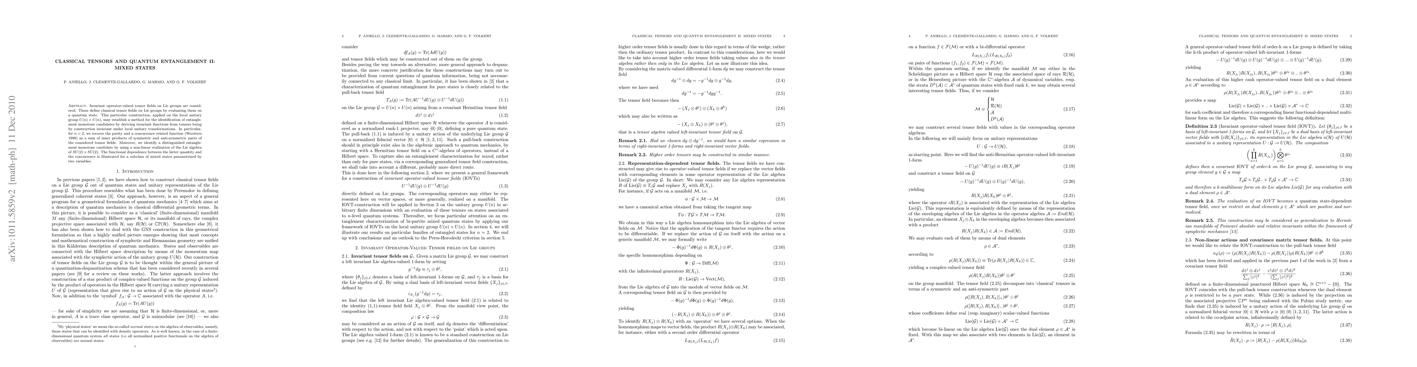 Invariant operator-valued tensor fields on Lie groups are considered. These define classical tensor fields on Lie groups by evaluating them on a quantum state. This particular construction, applied on the local unitary group U(n)xU(n), may establish a method for the identification of entanglement monotone candidates by deriving invariant functions from tensors being by construction invariant under local unitary transformations. In particular, for n=2, we recover the purity and a concurrence related function (Wootters 1998) as a sum of inner products of symmetric and anti-symmetric parts of the considered tensor fields. Moreover, we identify a distinguished entanglement monotone candidate by using a non-linear realization of the Lie algebra of SU(2)xSU(2). The functional dependence between the latter quantity and the concurrence is illustrated for a subclass of mixed states parametrized by two variables.
