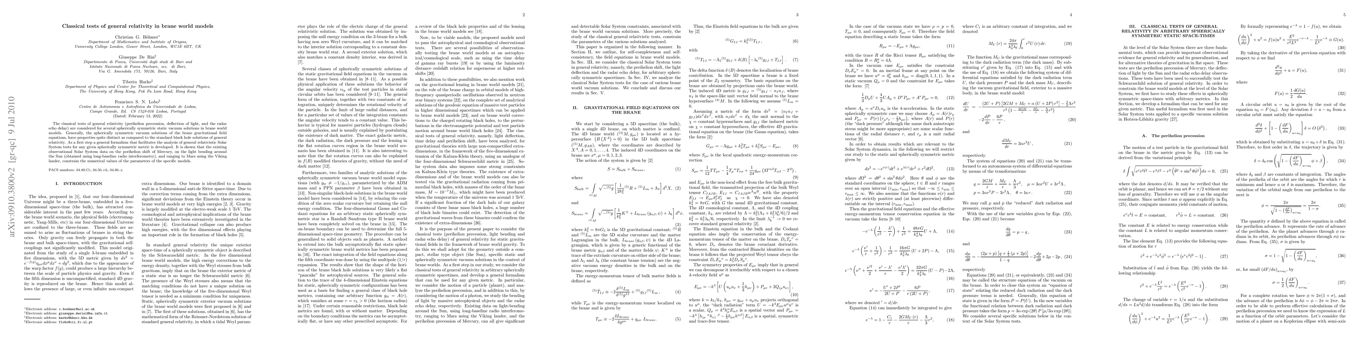 This paper develops a formalism to analyze classical tests of general relativity in brane world models, showing that these tests constrain the parameters of specific brane world models through observations of Mercury's perihelion shift, light bending around the Sun, and radar echo delay to Mars.