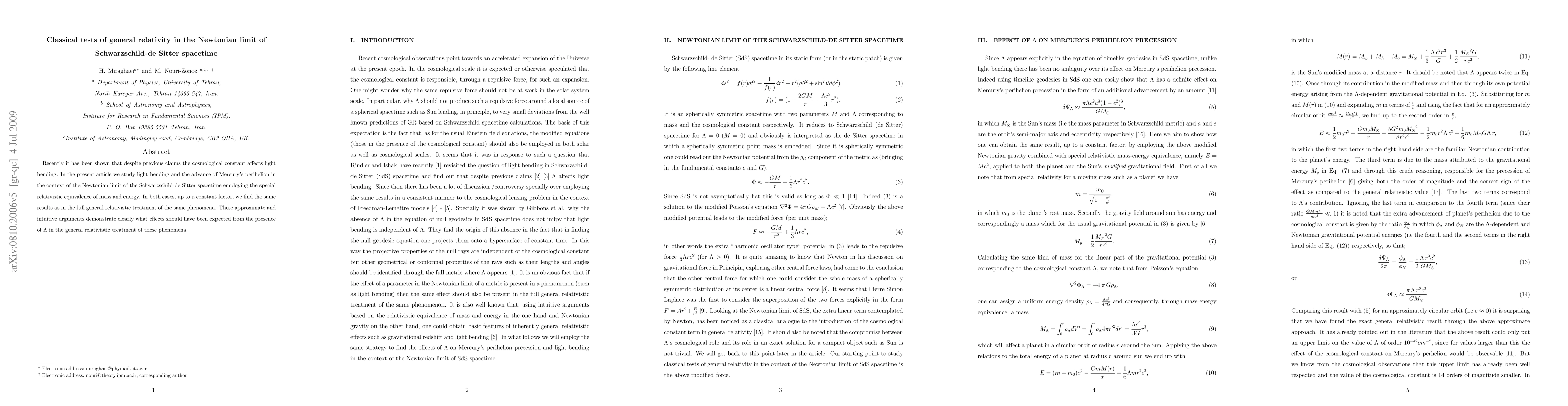 This paper investigates light bending and Mercury's perihelion advance in the Newtonian limit of Schwarzschild-de Sitter spacetime, showing that the cosmological constant influences these phenomena. The results align with full general relativistic predictions, highlighting the impact of $\Lambda$ in classical tests of general relativity.
