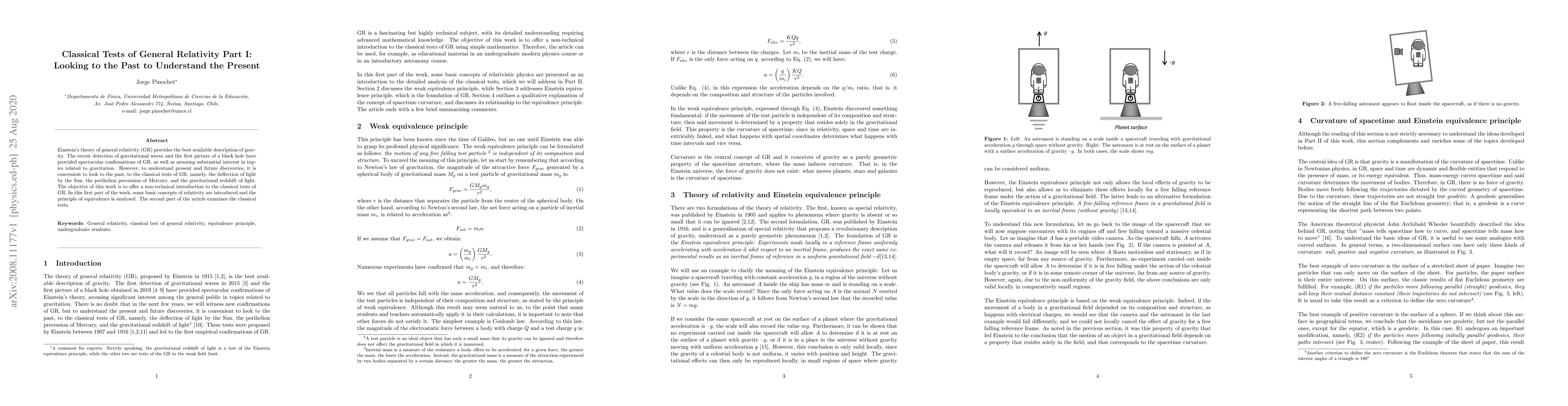 Einstein's theory of general relativity (GR) provides the best available description of gravity. The recent detection of gravitational waves and the first picture of a black hole have provided spectacular confirmations of GR, as well as arousing substantial interest in topics related to gravitation. However, to understand present and future discoveries, it is convenient to look to the past, to the classical tests of GR, namely, the deflection of light by the Sun, the perihelion precession of Mercury, and the gravitational redshift of light. The objective of this work is to offer a non-technical introduction to the classical tests of GR. In this first part of the work, some basic concepts of relativity are introduced and the principle of equivalence is analysed. The second part of the article examines the classical tests.