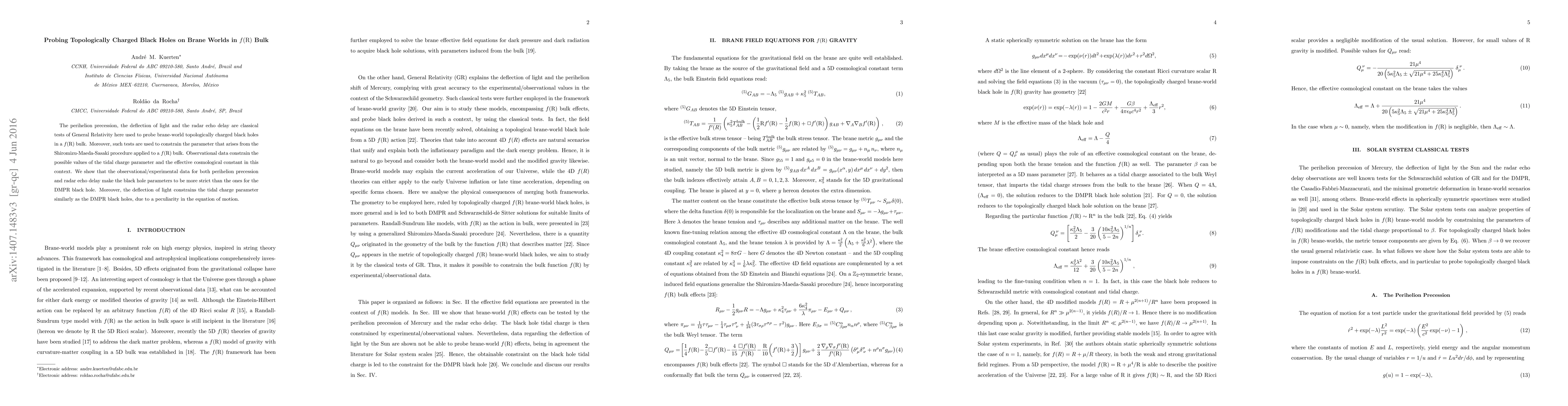 This paper uses classical tests of General Relativity to probe topologically charged black holes in a f(R) bulk on brane worlds, constraining the tidal charge parameter and effective cosmological constant. Observational data from perihelion precession and radar echo delay tighten constraints on the black hole parameter space compared to DMPR black holes, while light deflection constrains the tidal charge parameter similarly.