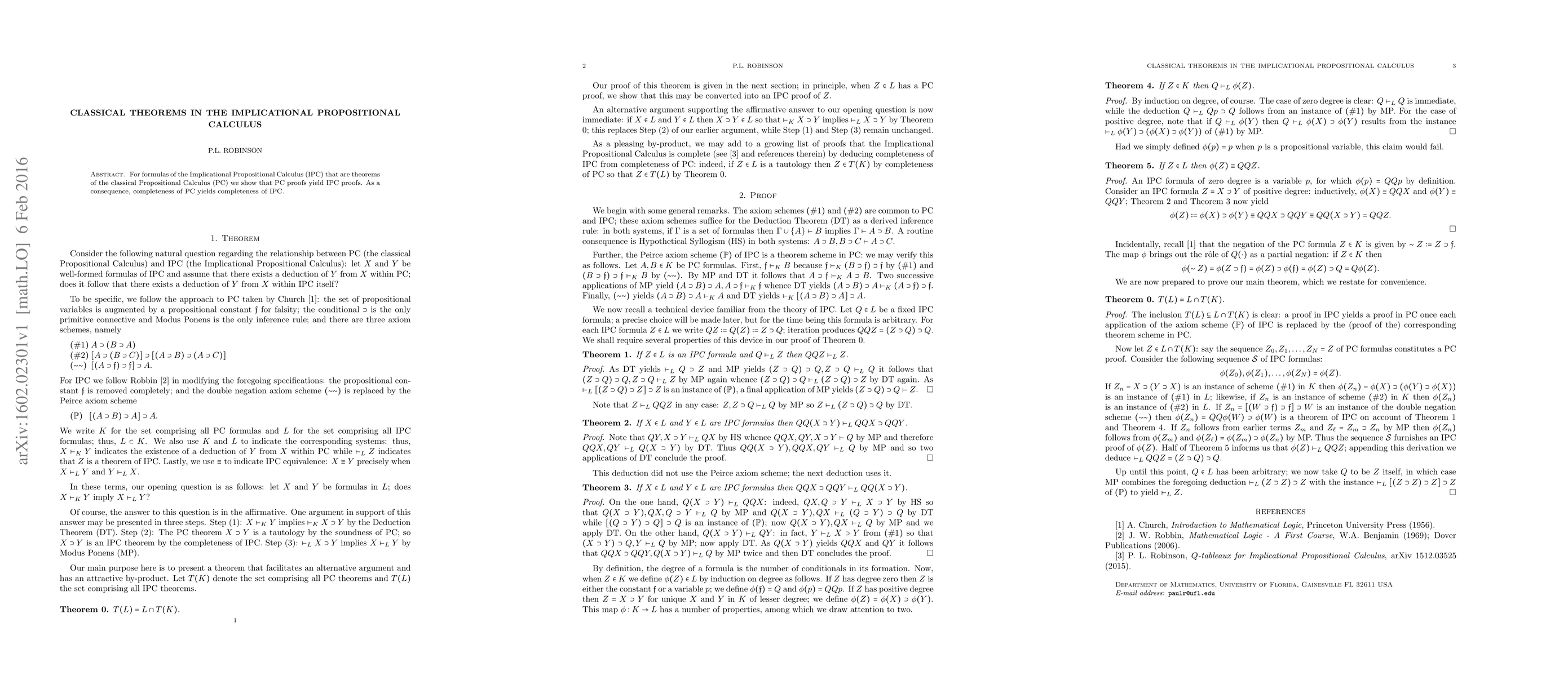 Summary: The paper demonstrates that classical theorems in classical Propositional Calculus (PC) can be translated into proofs in Implicational Propositional Calculus (IPC), thereby establishing IPC's completeness based on PC's completeness.
