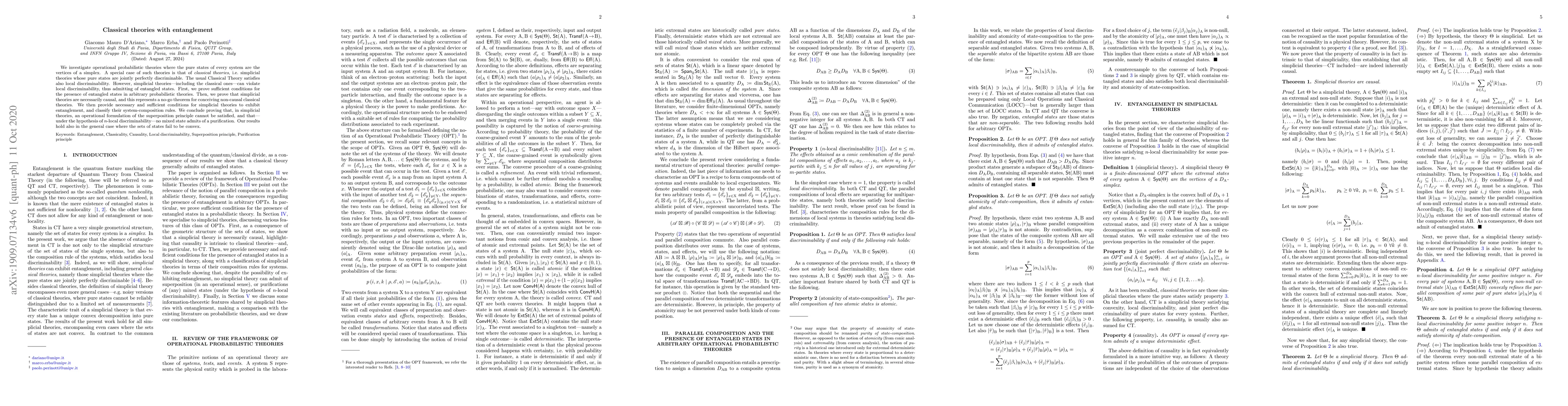 We investigate operational probabilistic theories where the pure states of every system are the vertices of a simplex. A special case of such theories is that of classical theories, i.e. simplicial theories whose pure states are jointly perfectly discriminable. The usual Classical Theory satisfies also local discriminability. However, simplicial theories---including the classical ones---can violate local discriminability, thus admitting of entangled states. First, we prove sufficient conditions for the presence of entangled states in arbitrary probabilistic theories. Then, we prove that simplicial theories are necessarily causal, and this represents a no-go theorem for conceiving non-causal classical theories. We then provide necessary and sufficient conditions for simplicial theories to exhibit entanglement, and classify their system-composition rules. We conclude proving that, in simplicial theories, an operational formulation of the superposition principle cannot be satisfied, and that---under the hypothesis of $n$-local discriminability---no mixed state admits of a purification. Our results hold also in the general case where the sets of states fail to be convex.