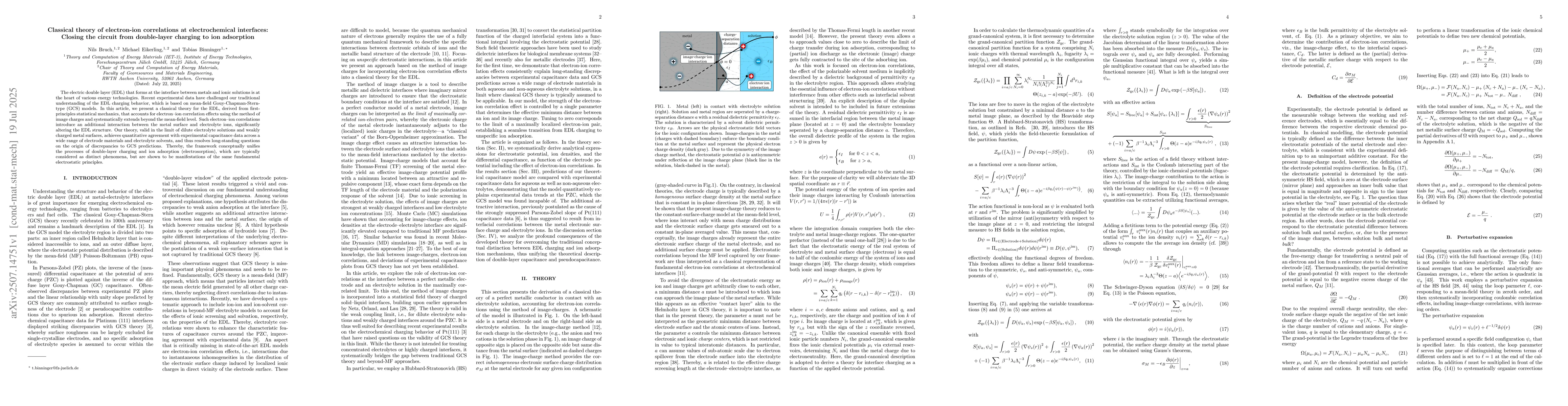 The electric double layer (EDL) that forms at the interface between metals and ionic solutions is at the heart of various energy technologies. Recent experimental data have challenged our traditional understanding of the EDL charging behavior, which is based on mean-field Gouy-Chapman-Stern-type (GCS) models. In this article, we present a classical theory for the EDL, derived from first-principles statistical mechanics, that accounts for electron-ion correlation effects using the method of image charges and systematically extends beyond the mean-field level. Such electron-ion correlations introduce an additional interaction between the metal surface and electrolyte ions, significantly altering the EDL structure. Our theory, valid in the limit of dilute electrolyte solutions and weakly charged metal surfaces, achieves quantitative agreement with experimental capacitance data across a wide range of electrode materials and electrolyte solvents, and thus resolves long-standing questions on the origin of discrepancies to GCS predictions. Thereby, the framework conceptually unifies the processes of double-layer charging and ion adsorption (electrosorption), which are typically considered as distinct phenomena, but are shown to be manifestations of the same fundamental electrostatic principles.