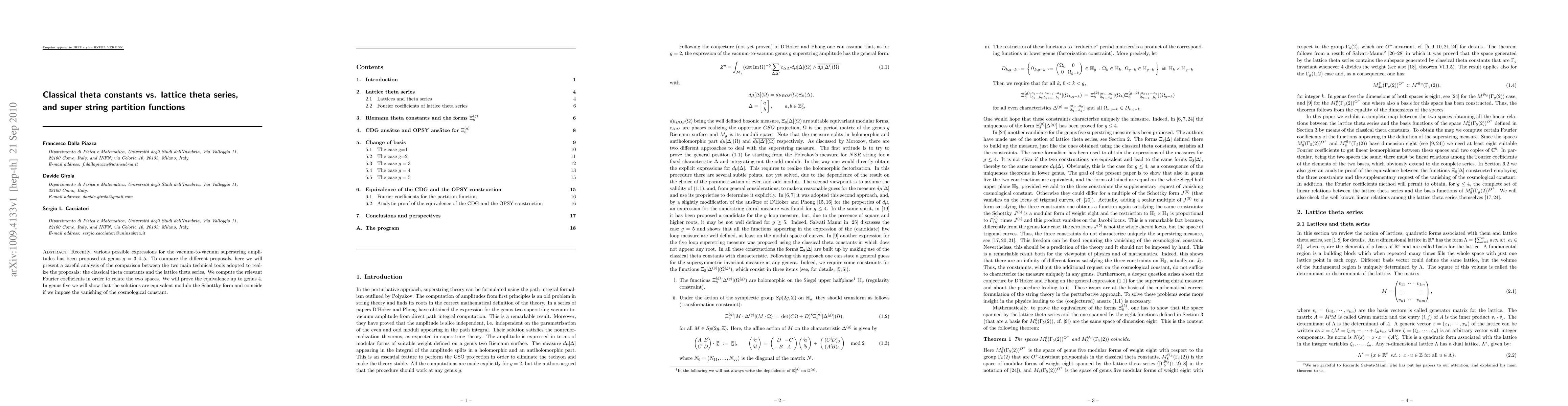 This paper compares classical theta constants and lattice theta series as tools for proposing superstring partition functions, proving their equivalence up to genus 4 and showing equivalence in genus 5 under specific conditions, including the vanishing cosmological constant.