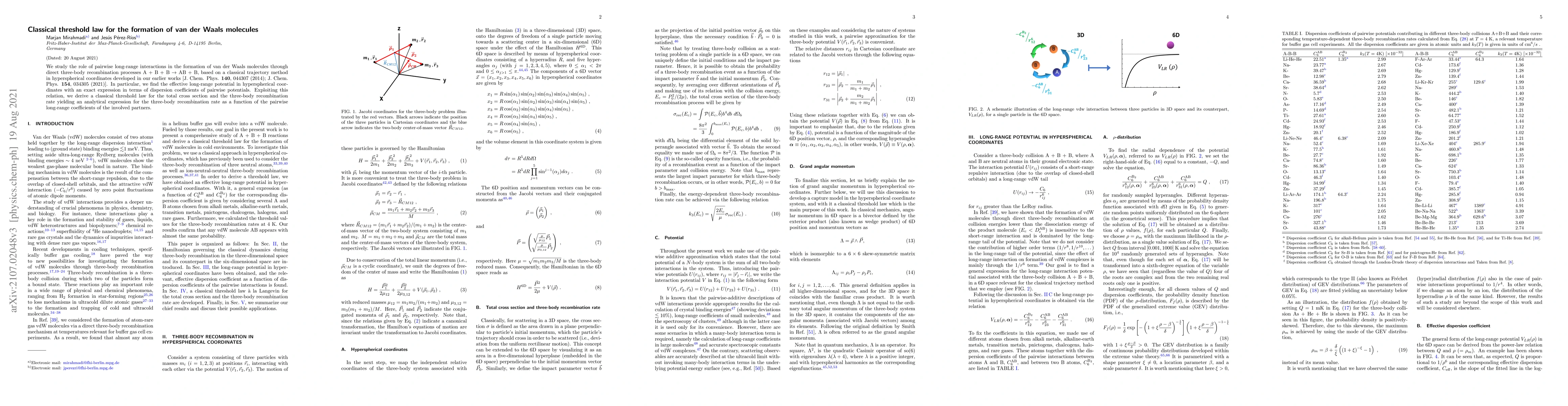 This paper investigates the classical threshold law for the formation of van der Waals molecules via three-body recombination processes, deriving an analytical expression for the recombination rate based on the pairwise long-range interactions and dispersion coefficients. The study employs a classical trajectory method in hyperspherical coordinates.