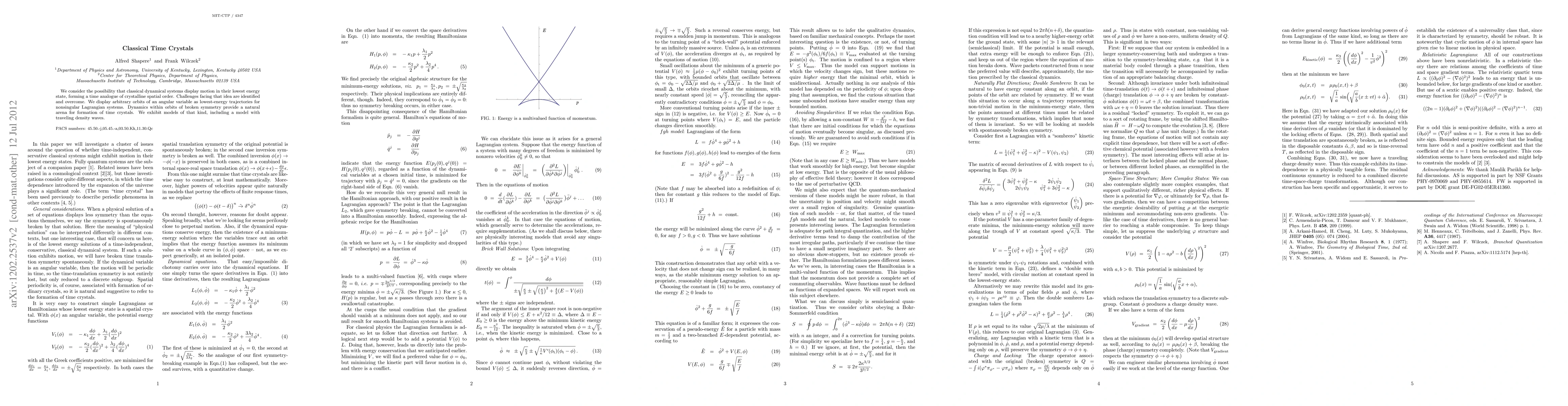 Researchers demonstrate that classical dynamical systems can form time crystals, which are periodic motion patterns in their lowest energy state, akin to crystalline order in space. They show models of these phenomena, including a model with traveling density waves, using arbitrary orbits of an angular variable as lowest-energy trajectories.