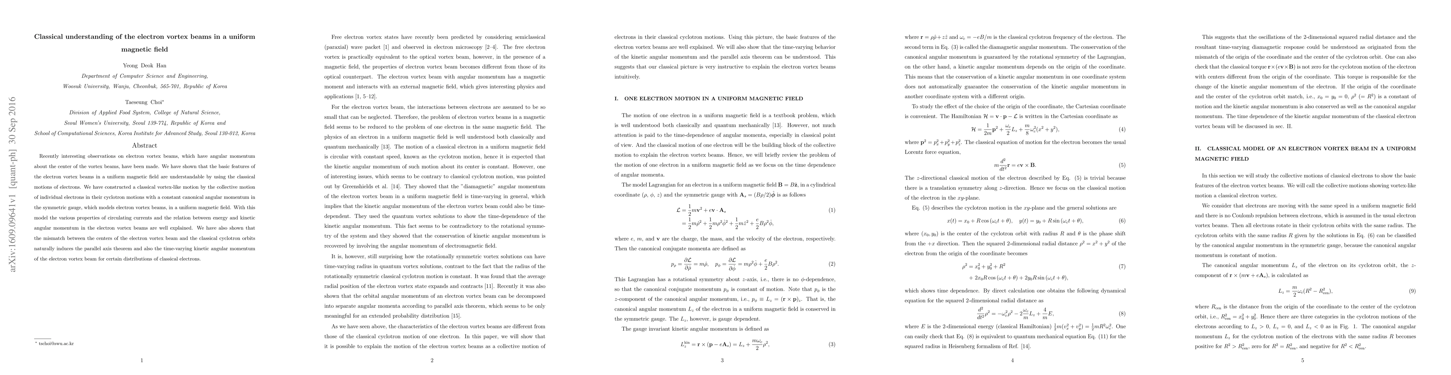 This paper explores the classical understanding of electron vortex beams, demonstrating that their behavior in a uniform magnetic field can be modeled using the collective cyclotron motion of electrons, thus explaining properties like circulating currents and the relationship between energy and kinetic angular momentum. The study also highlights how the misalignment between vortex beam centers and cyclotron orbits induces the parallel axis theorem and time-varying kinetic angular momentum.
